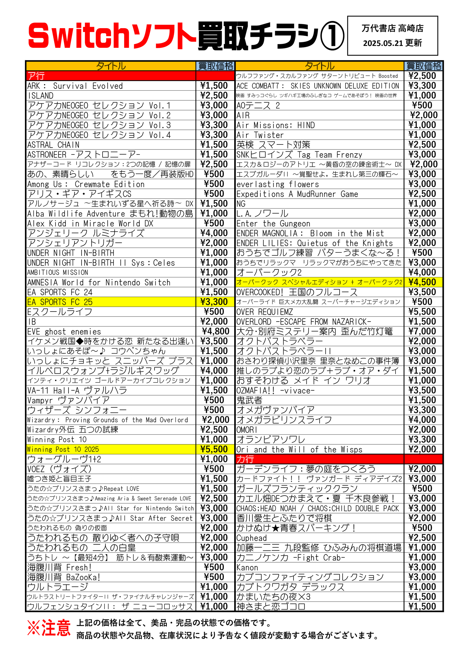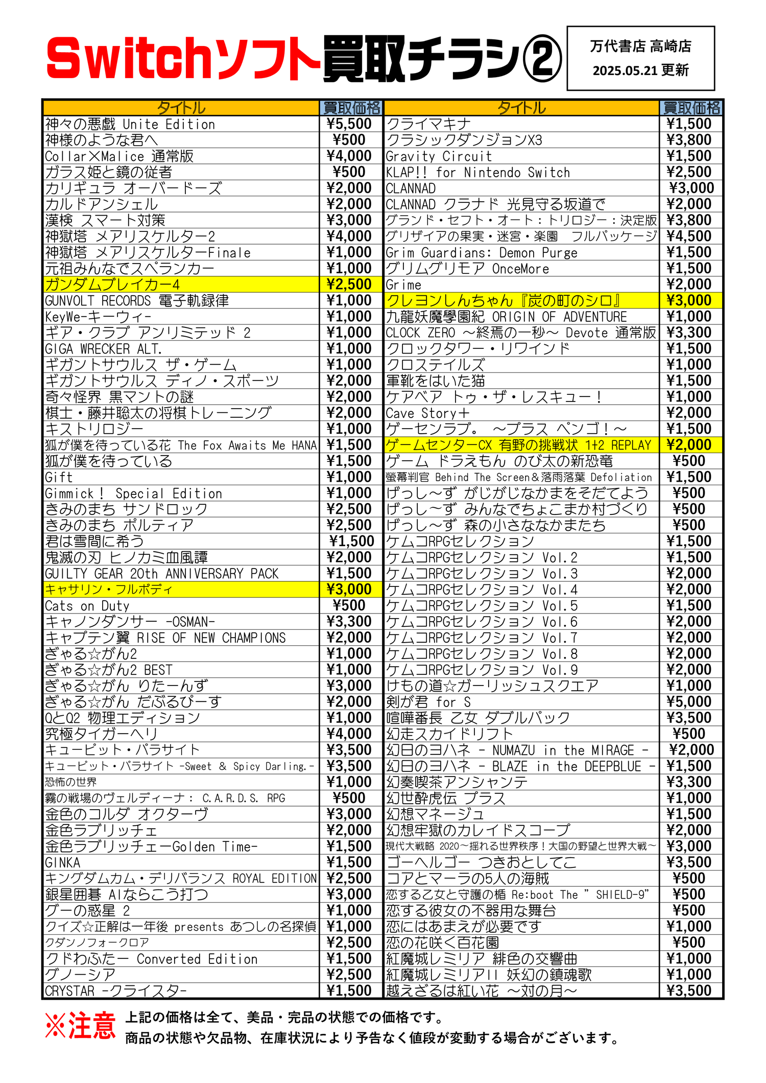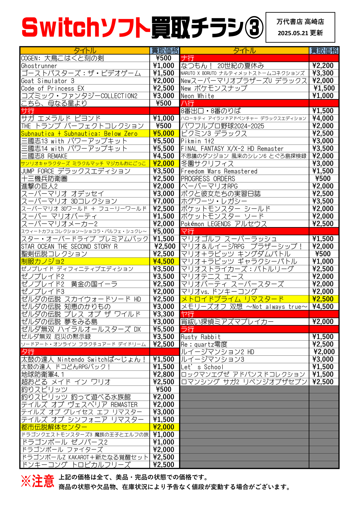 2025.05.21 万代高崎 takalab_5 【R7.5.21更新】Switchソフト買取告知、最新作から旧作まで掲載中! 🎮買取情報更新🎮 ※2025/5/21現在の価格となります。 在庫状況・状態によってお値段が変動いたします。予めご了承ください。 ************************************** ⇩その他買取情報はこちら⇩ ★万代書店高崎店WEBチラシ★ ⇩最新のイベント情報はこちら⇩ ★万代書店高崎店イベントカレンダー★ コメントを残す コメントをキャンセルメールアドレスが公開されることはありません。 ※ が付いている欄は必須項目ですコメント ※ 名前 ※ メール ※ サイト 新しいコメントをメールで通知 新しい投稿をメールで受け取る Δ