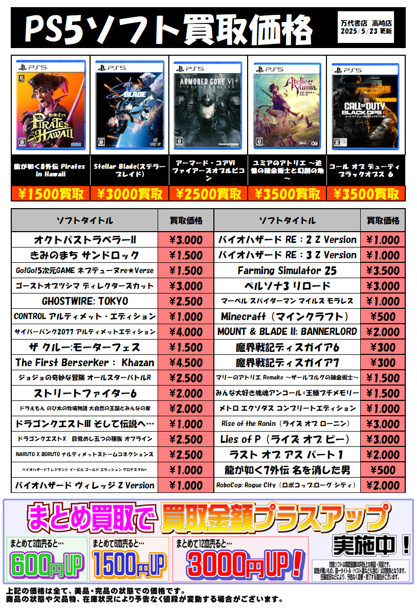 2025.05.23 万代高崎 takalab_6 ◆PS5ソフト買取チラシ更新しました!◆ 🎮買取情報🎮 ※2025/5/23現在の価格となります。 在庫状況・状態によってお値段が変動いたします。予めご了承ください。 ************************************** ⇩その他買取情報はこちら⇩ ★万代書店高崎店WEBチラシ★ ⇩最新のイベント情報はこちら⇩ ★万代書店高崎店イベントカレンダー★ コメントを残す コメントをキャンセルメールアドレスが公開されることはありません。 ※ が付いている欄は必須項目ですコメント ※ 名前 ※ メール ※ サイト 新しいコメントをメールで通知 新しい投稿をメールで受け取る Δ