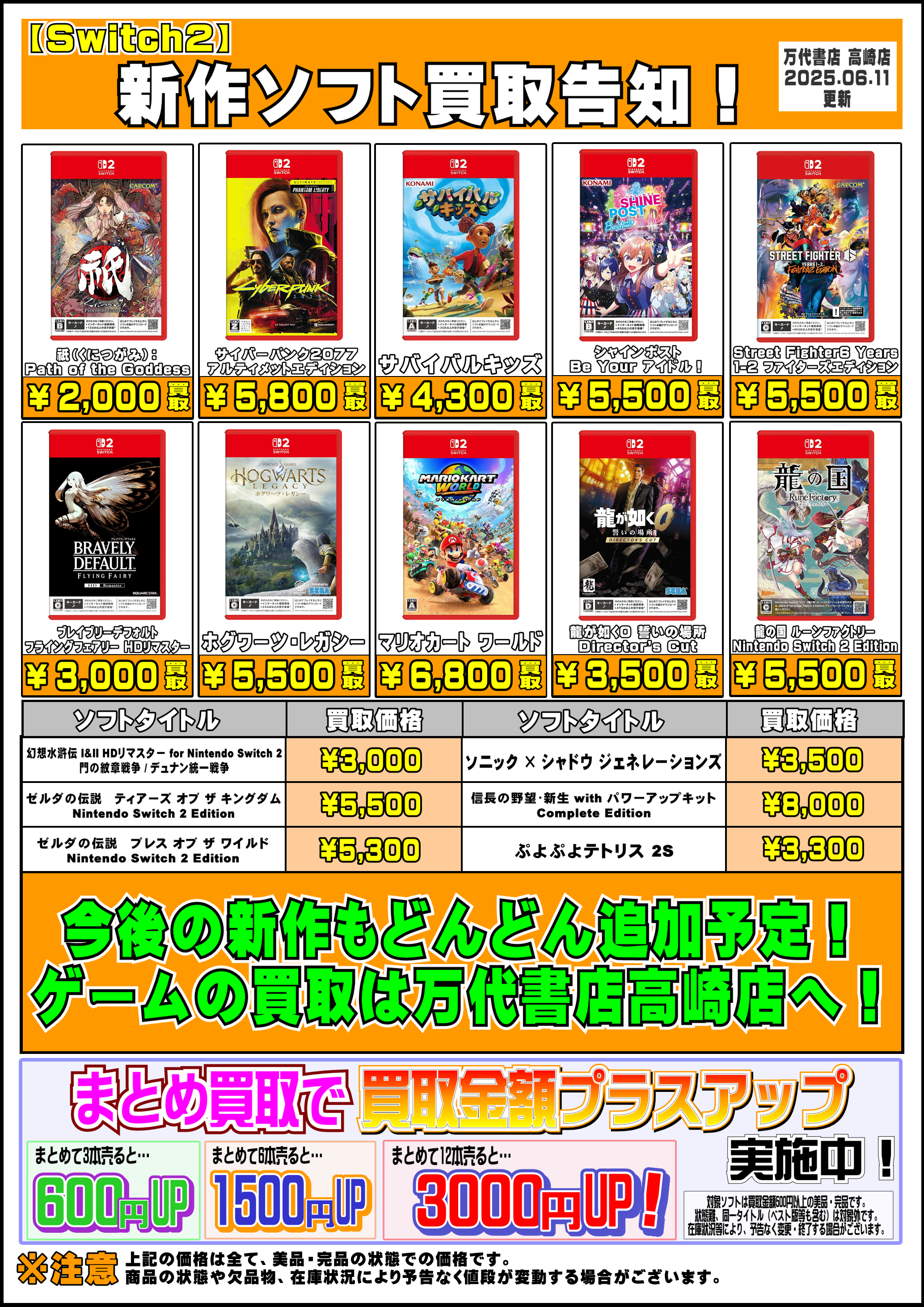 2025.06.11 緊急買取告知! takalab_2 【R7.6.11更新】Switch&Switch2ソフト買取告知、掲載中!■ 【R7.6.11更新】Switch&Switch2ソフト買取告知、掲載中! ※2025/6/11現在の価格となります。 在庫状況・状態によってお値段が変動いたします。予めご了承ください。 ************************************** ⇩その他買取情報はこちら⇩ ★万代書店高崎店WEBチラシ★ ⇩最新のイベント情報はこちら⇩ ★万代書店高崎店イベントカレンダー★ コメントを残す コメントをキャンセルメールアドレスが公開されることはありません。 ※ が付いている欄は必須項目ですコメント ※ 名前 ※ メール ※ サイト 新しいコメントをメールで通知 新しい投稿をメールで受け取る Δ