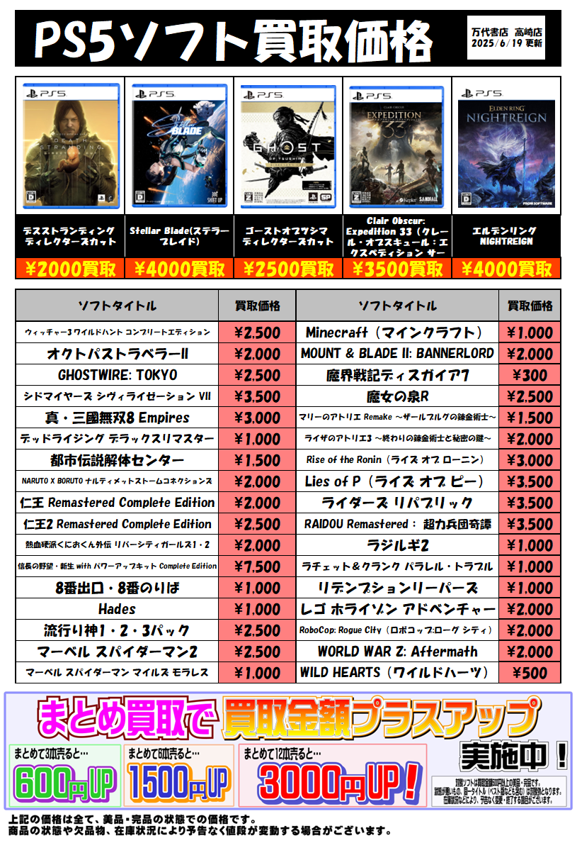 2025.06.19 緊急買取告知! takalab_2 ★PS5ソフト買取告知★ ★買取情報★ ※2025/6/19現在の価格となります。 在庫状況・状態によってお値段が変動いたします。予めご了承ください。 ************************************** ⇩その他買取情報はこちら⇩ ★万代書店高崎店WEBチラシ★ ⇩最新のイベント情報はこちら⇩ ★万代書店高崎店イベントカレンダー★ コメントを残す コメントをキャンセルメールアドレスが公開されることはありません。 ※ が付いている欄は必須項目ですコメント ※ 名前 ※ メール ※ サイト 新しいコメントをメールで通知 新しい投稿をメールで受け取る Δ