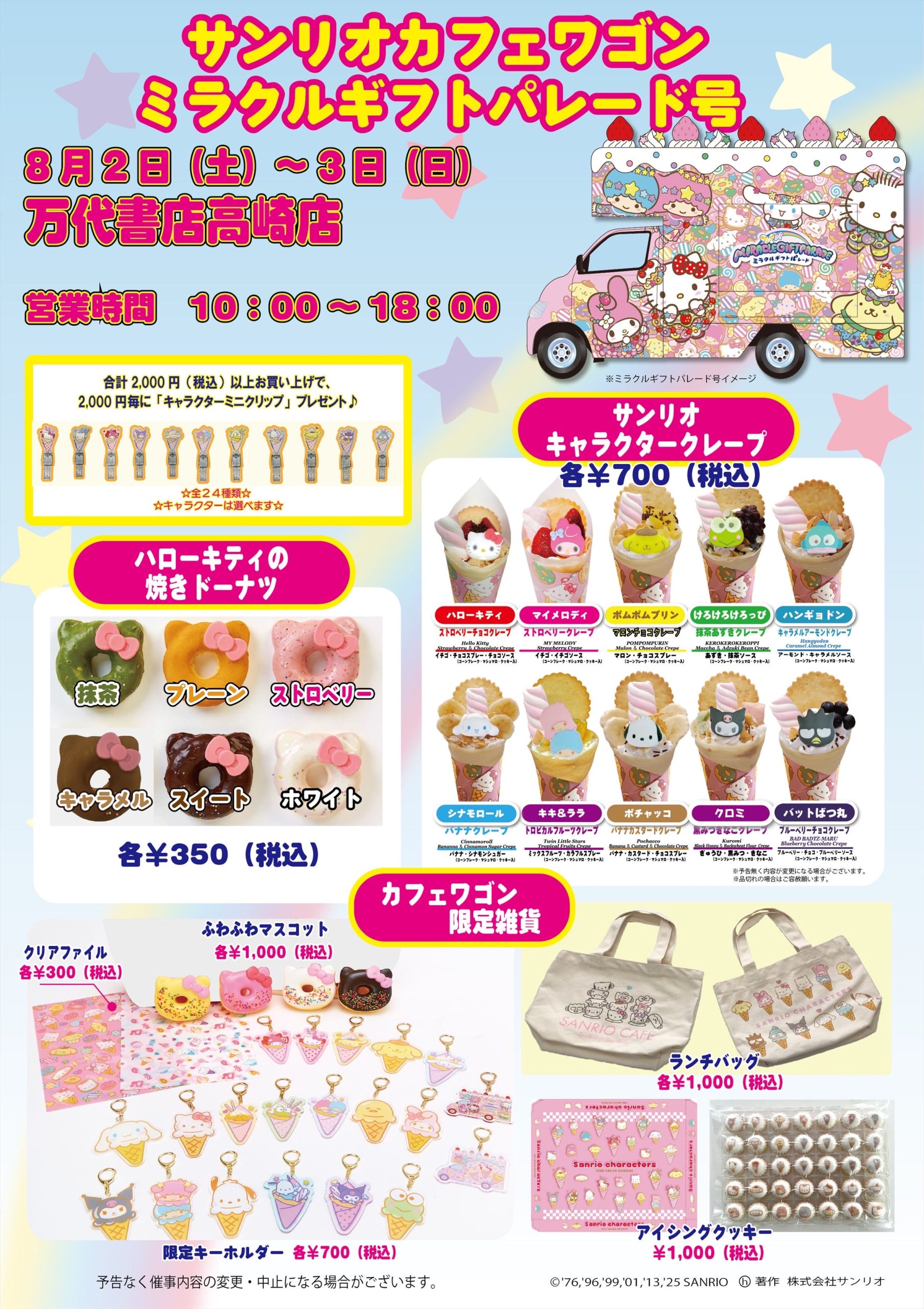 2025.07.28 イベント takalab_1 8月2日〜3日 大人気!サンリオカフェワゴンがやって来ます! 2025年8月2日(土)〜3日(日) 10:00〜18:00 とってもかわいいサンリオカフェワゴンが正面玄関前に登場! その他にも夏休みはイベント盛りだくさんでお客様をお迎えいたします! お楽しみに! ************************************** ⇩その他買取情報はこちら⇩ ★万代書店高崎店WEBチラシ★ ⇩最新のイベント情報はこちら⇩ ★万代書店高崎店イベントカレンダー★ コメントを残す コメントをキャンセルメールアドレスが公開されることはありません。 ※ が付いている欄は必須項目ですコメント ※ 名前 ※ メール ※ サイト 新しいコメントをメールで通知 新しい投稿をメールで受け取る Δ