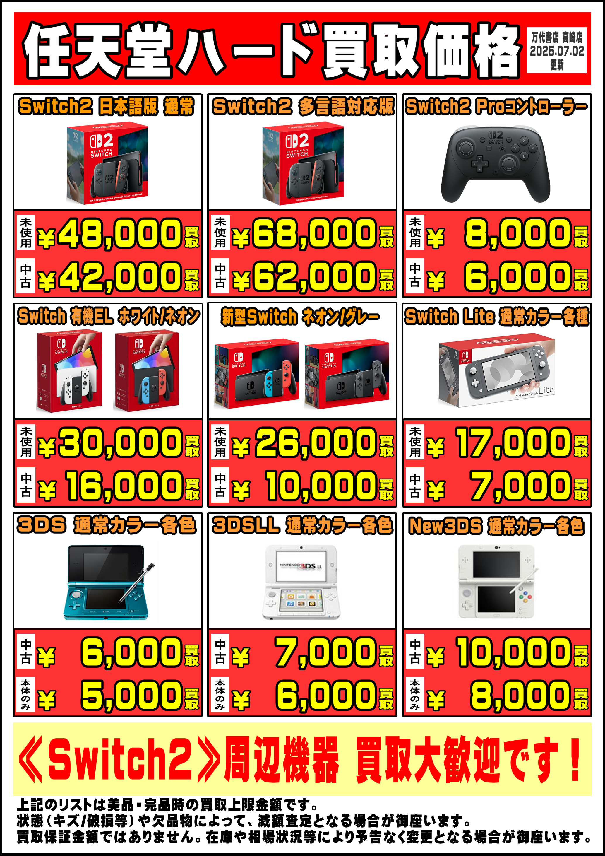 2025.07.03 万代高崎 takalab_6 ◆任天堂ハード 買取情報更新しました!◆ ゲーム買取情報です📣 ※2025/7/3現在の価格となります。 在庫状況・状態によってお値段が変動いたします。予めご了承ください。 ************************************** ⇩その他買取情報はこちら⇩ ★万代書店高崎店WEBチラシ★ ⇩最新のイベント情報はこちら⇩ ★万代書店高崎店イベントカレンダー★ コメントを残す コメントをキャンセルメールアドレスが公開されることはありません。 ※ が付いている欄は必須項目ですコメント ※ 名前 ※ メール ※ サイト 新しいコメントをメールで通知 新しい投稿をメールで受け取る Δ