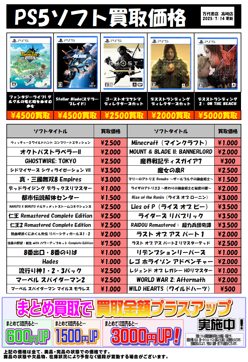 2025.07.14 万代高崎 takalab_6 ◆PS5ソフト買取チラシ 更新しました!◆ 🎮買取情報🎮 ※2025/7/14現在の価格となります。 在庫状況・状態によってお値段が変動いたします。予めご了承ください。 ************************************** ⇩その他買取情報はこちら⇩ ★万代書店高崎店WEBチラシ★ ⇩最新のイベント情報はこちら⇩ ★万代書店高崎店イベントカレンダー★ コメントを残す コメントをキャンセルメールアドレスが公開されることはありません。 ※ が付いている欄は必須項目ですコメント ※ 名前 ※ メール ※ サイト 新しいコメントをメールで通知 新しい投稿をメールで受け取る Δ