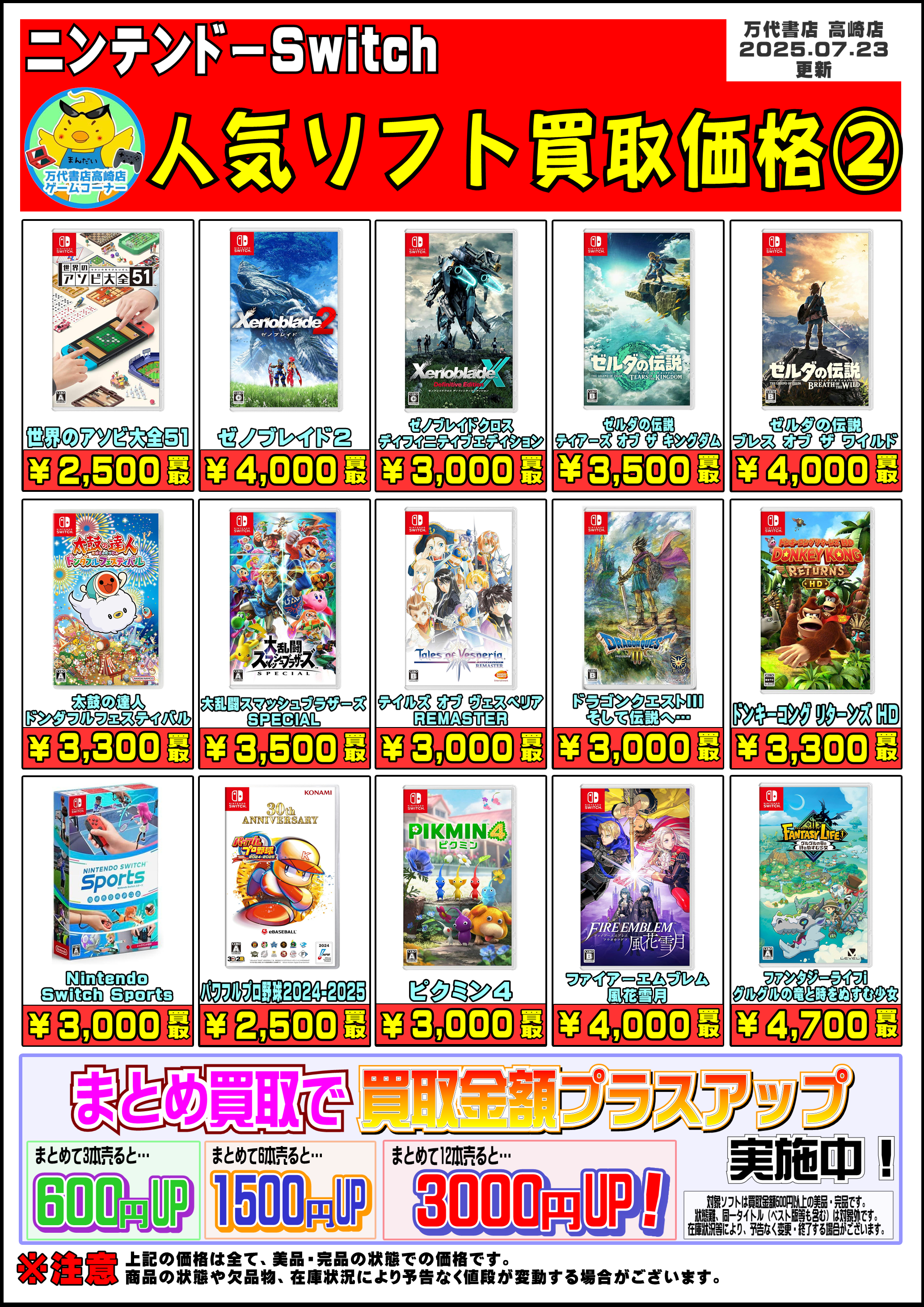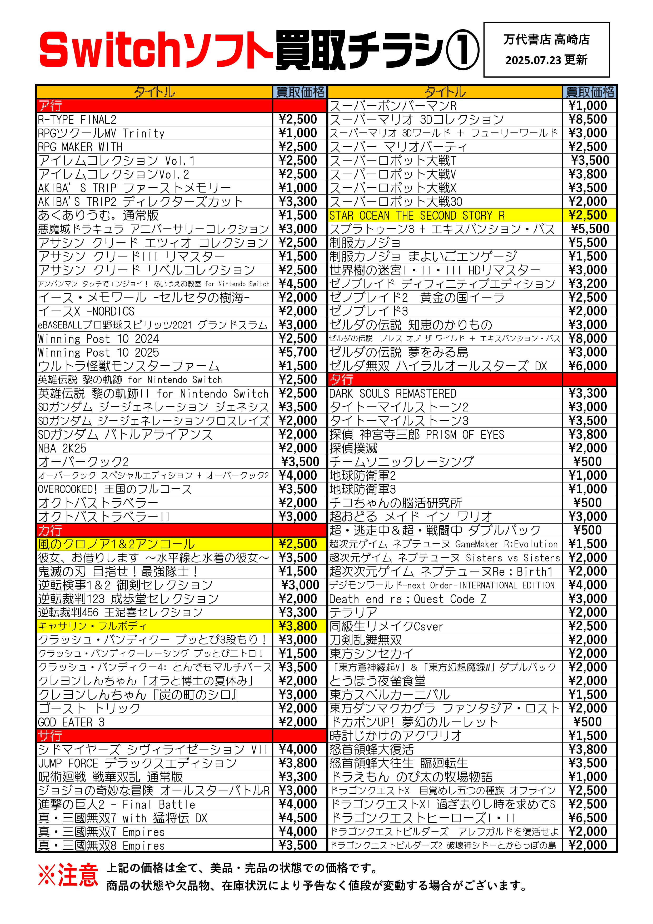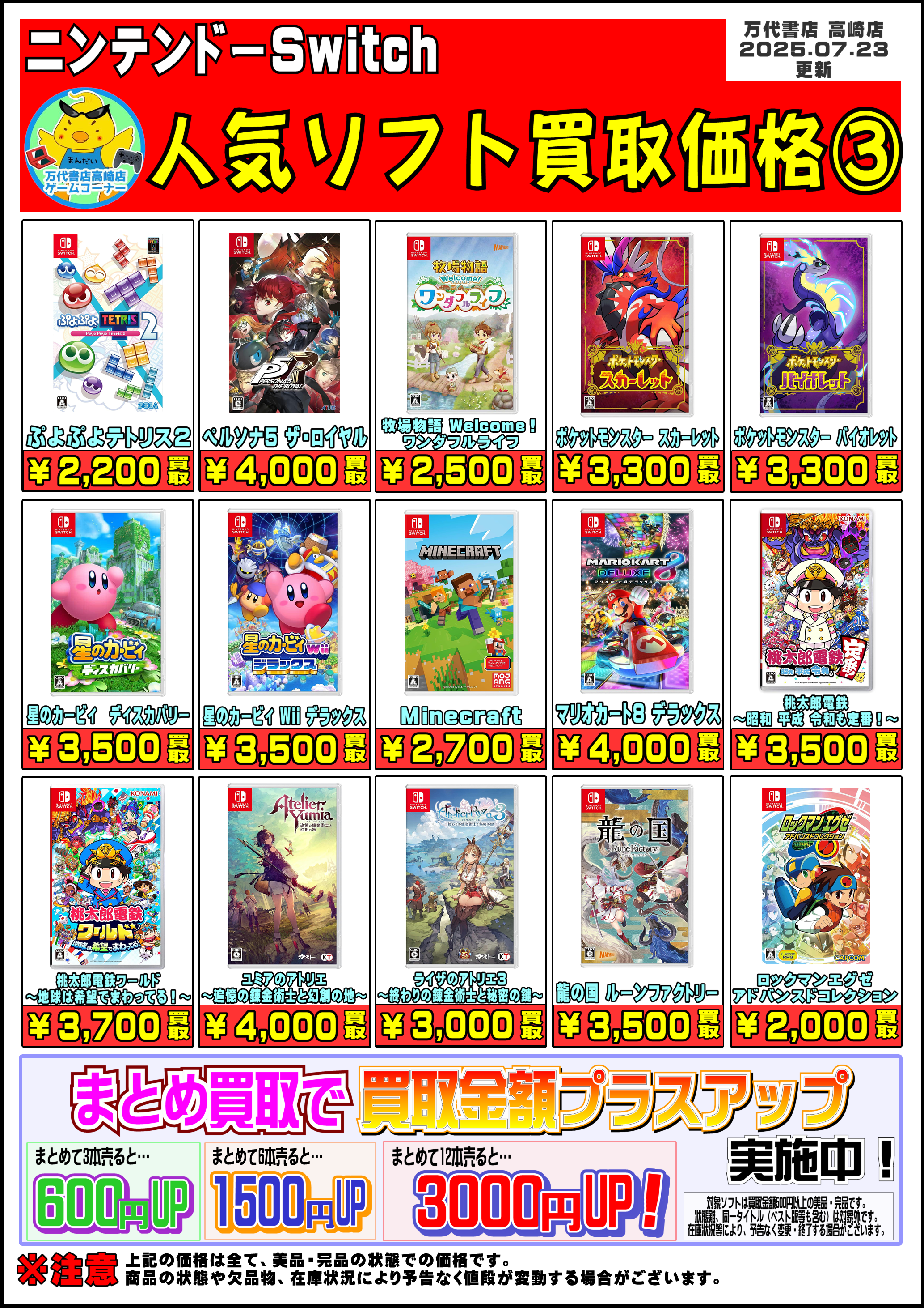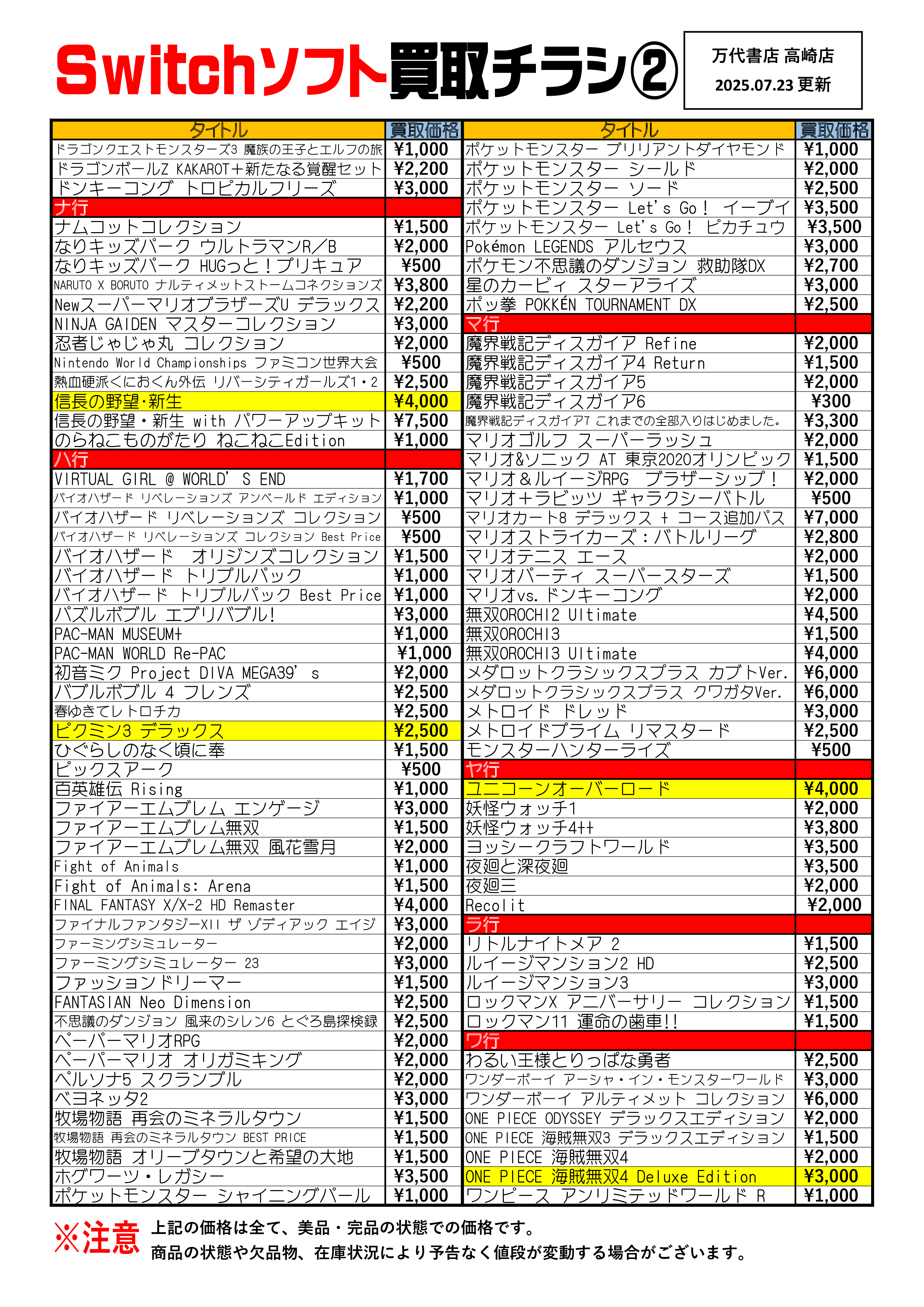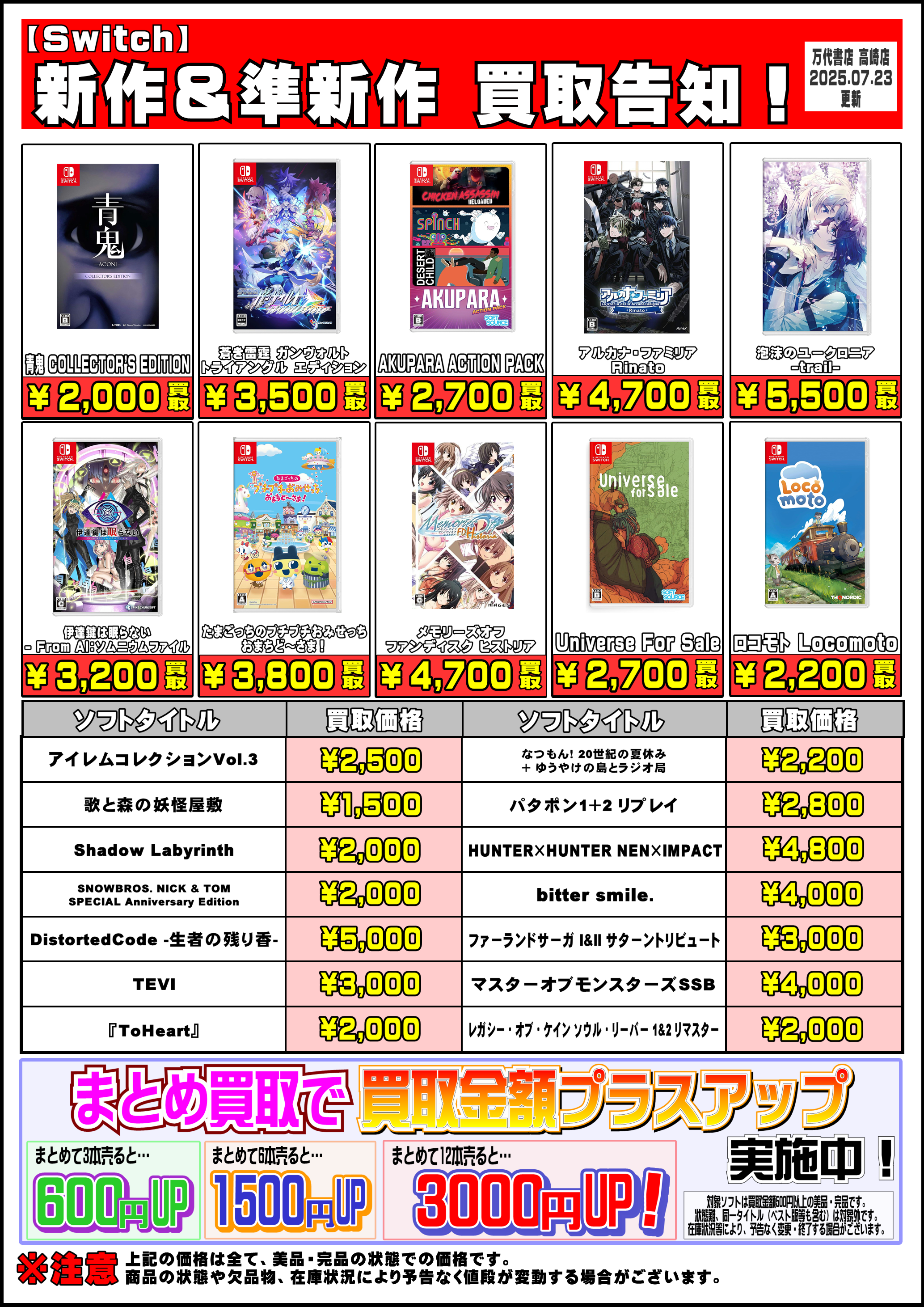 2025.07.24 万代高崎 takalab_6 【R7.7.23更新】Switch&Switch2ソフト買取告知、掲載中! Switchソフト買取情報📣 ※2025/7/23現在の価格となります。 在庫状況・状態によってお値段が変動いたします。予めご了承ください。 ************************************** ⇩その他買取情報はこちら⇩ ★万代書店高崎店WEBチラシ★ ⇩最新のイベント情報はこちら⇩ ★万代書店高崎店イベントカレンダー★ コメントを残す コメントをキャンセルメールアドレスが公開されることはありません。 ※ が付いている欄は必須項目ですコメント ※ 名前 ※ メール ※ サイト 新しいコメントをメールで通知 新しい投稿をメールで受け取る Δ
