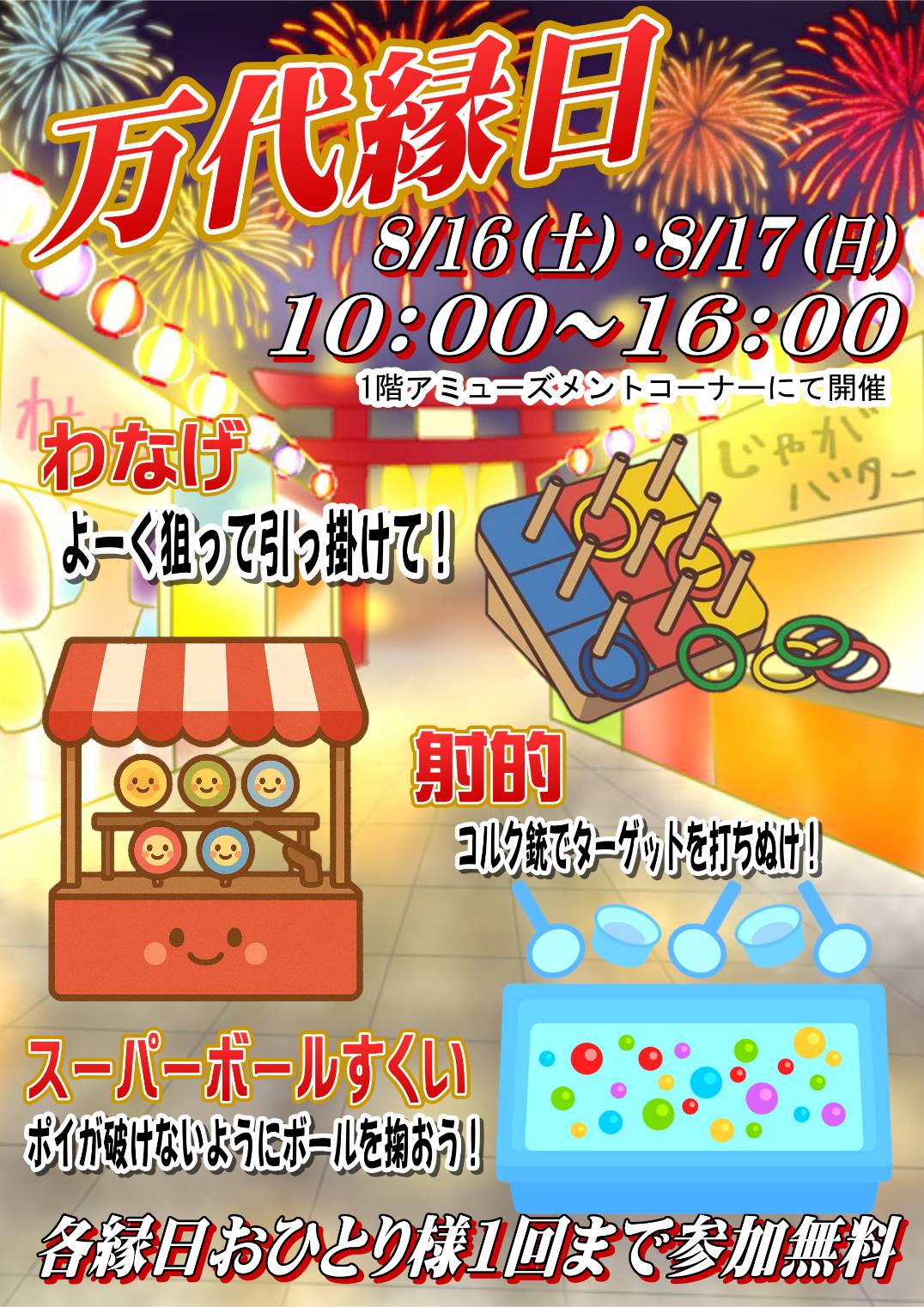 2025.08.15 イベント takalab_3 【イベント情報】万台縁日【8/16(土)・8/17(日)】 今週末は 【万代縁日】開催🎆 開催場所:1階フロア 開催日程:8/16(土)~8/17(日) 10:00~16:00 それぞれの遊びを、お一人様1回づつ遊べちゃいます😍 ぜひぜひ遊びに来てね‼️ ************************************** ⇩その他買取情報はこちら⇩ ★万代書店高崎店WEBチラシ★ ⇩最新のイベント情報はこちら⇩ ★万代書店高崎店イベントカレンダー★ コメントを残す コメントをキャンセルメールアドレスが公開されることはありません。 ※ が付いている欄は必須項目ですコメント ※ 名前 ※ メール ※ サイト 新しいコメントをメールで通知 新しい投稿をメールで受け取る Δ