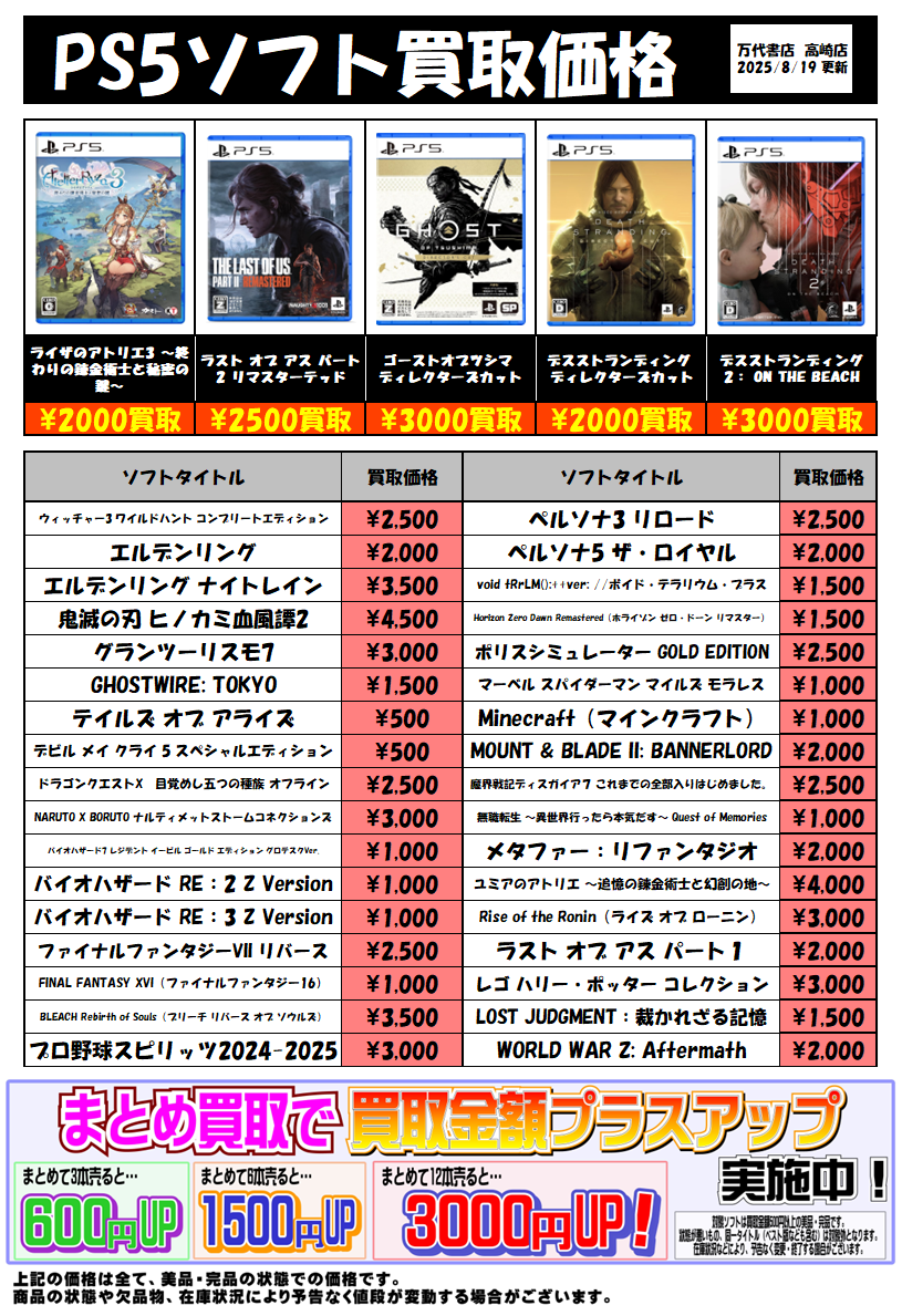 2025.08.19 緊急買取告知! takalab_2 ★PS5ソフト買取告知★ ★買取情報★ ※2025/8/19現在の価格となります。 在庫状況・状態によってお値段が変動いたします。予めご了承ください。 ************************************** ⇩その他買取情報はこちら⇩ ★万代書店高崎店WEBチラシ★ ⇩最新のイベント情報はこちら⇩ ★万代書店高崎店イベントカレンダー★ コメントを残す コメントをキャンセルメールアドレスが公開されることはありません。 ※ が付いている欄は必須項目ですコメント ※ 名前 ※ メール ※ サイト 新しいコメントをメールで通知 新しい投稿をメールで受け取る Δ