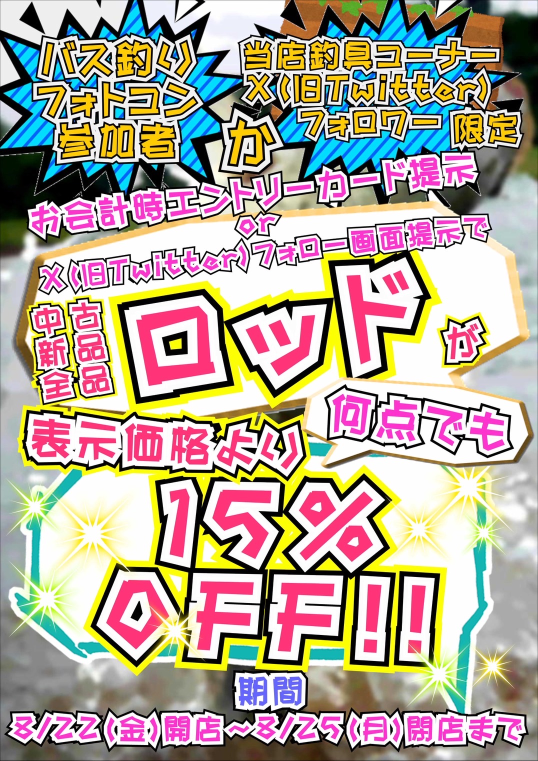 2025.08.21 イベント takalab_1 8月バス釣りフォトコン参加者&Xフォロワー特典 8/22(金)〜8/25(月)閉店まで ロッド全品15%OFF❗️を開催します‼️ 釣具イベント 8月バス釣りフォトコン参加者&Xフォロワー特典 8/22(金)〜8/25(月)閉店まで ロッド全品15%OFF❗️を開催します‼️ バスロッド、トラウトロッド、ソルト系などジャンル問わずに全て対象となります お宝探しに売場チェックお願いします😊 ************************************** ⇩その他買取情報はこちら⇩ ★万代書店高崎店WEBチラシ★ ⇩最新のイベント情報はこちら⇩ ★万代書店高崎店イベントカレンダー★ コメントを残す コメントをキャンセルメールアドレスが公開されることはありません。 ※ が付いている欄は必須項目ですコメント ※ 名前 ※ メール ※ サイト 新しいコメントをメールで通知 新しい投稿をメールで受け取る Δ