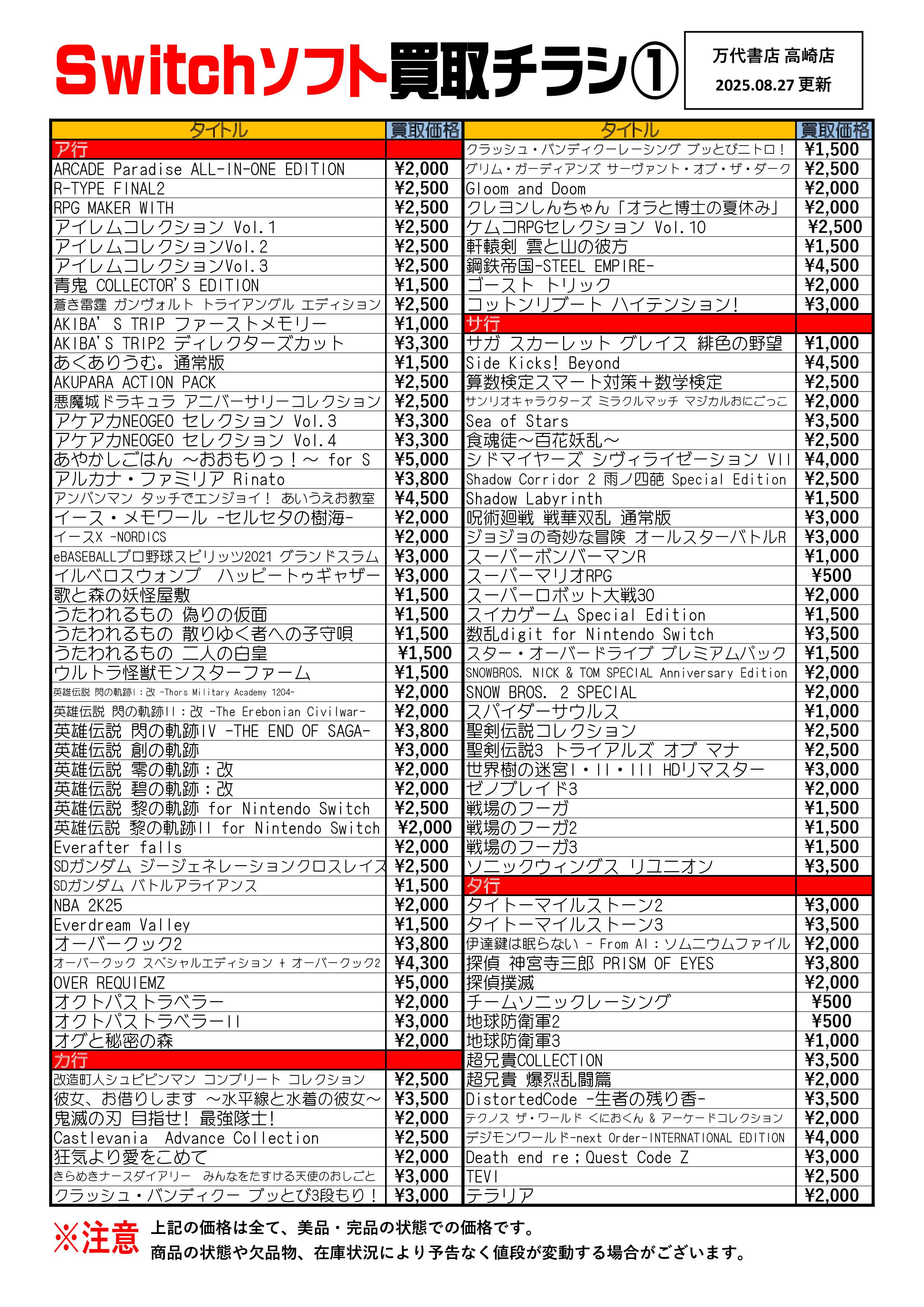 2025.08.27 ゲーム買取 takalab_5 【R7.8.27更新】Switch&Switch2ソフト買取告知、掲載中! 【R7.8.27更新】Switch&Switch2ソフト買取告知、掲載中! ※2025/8/27現在の価格となります。 在庫状況・状態によってお値段が変動いたします。予めご了承ください。 ************************************** ⇩その他買取情報はこちら⇩ ★万代書店高崎店WEBチラシ★ ⇩最新のイベント情報はこちら⇩ ★万代書店高崎店イベントカレンダー★ コメントを残す コメントをキャンセルメールアドレスが公開されることはありません。 ※ が付いている欄は必須項目ですコメント ※ 名前 ※ メール ※ サイト 新しいコメントをメールで通知 新しい投稿をメールで受け取る Δ