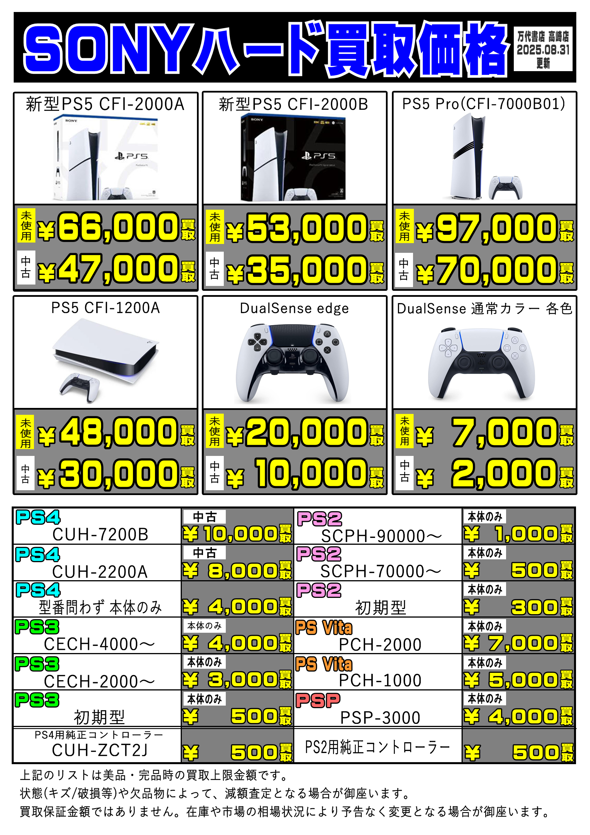 2025.08.31 ゲーム買取 takalab_1 Switchハード、SONYハードチラシ更新しました! Switchハード、SONYハードチラシ更新しました! ※2025/8/31現在の価格となります。 在庫状況・状態によってお値段が変動いたします。予めご了承ください。 ************************************** ⇩その他買取情報はこちら⇩ ★万代書店高崎店WEBチラシ★ ⇩最新のイベント情報はこちら⇩ ★万代書店高崎店イベントカレンダー★ コメントを残す コメントをキャンセルメールアドレスが公開されることはありません。 ※ が付いている欄は必須項目ですコメント ※ 名前 ※ メール ※ サイト 新しいコメントをメールで通知 新しい投稿をメールで受け取る Δ