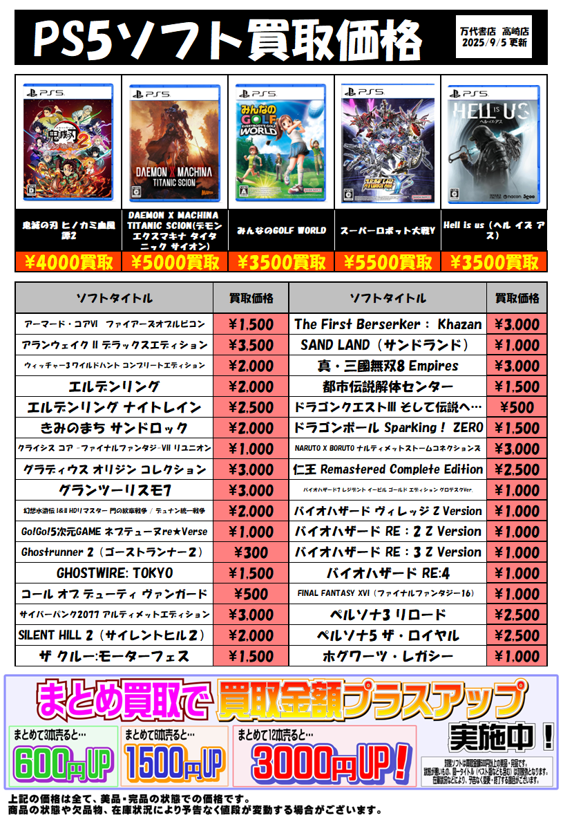 2025.09.05 万代高崎 takalab_6 ◆PS5ソフト買取チラシ更新しました!◆ 🎮買取情報🎮 ※2025/9/5現在の価格となります。 在庫状況・状態によってお値段が変動いたします。予めご了承ください。 ************************************** ⇩その他買取情報はこちら⇩ ★万代書店高崎店WEBチラシ★ ⇩最新のイベント情報はこちら⇩ ★万代書店高崎店イベントカレンダー★ コメントを残す コメントをキャンセルメールアドレスが公開されることはありません。 ※ が付いている欄は必須項目ですコメント ※ 名前 ※ メール ※ サイト 新しいコメントをメールで通知 新しい投稿をメールで受け取る Δ