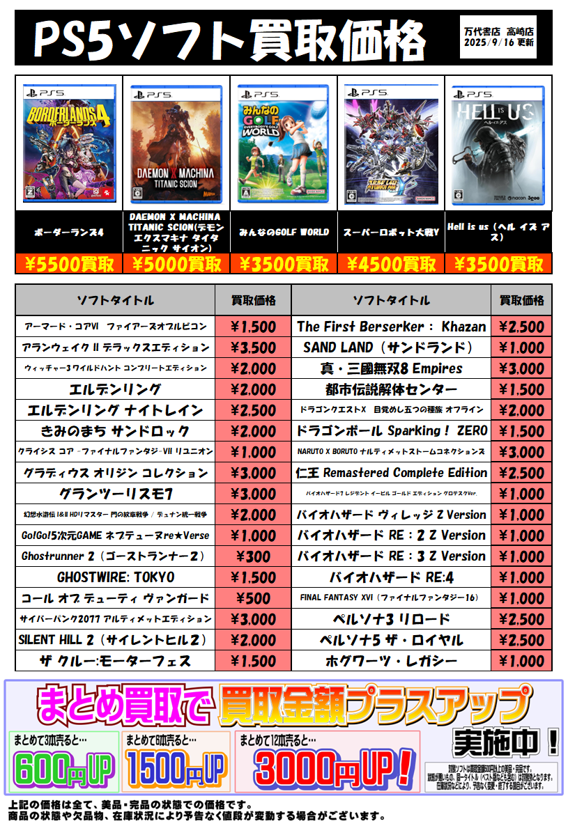 2025.09.16 万代高崎 takalab_6 ◆PS5ソフト 買取チラシ更新しました!◆ 🎮買取情報🎮 ※2025/9/16現在の価格となります。 在庫状況・状態によってお値段が変動いたします。予めご了承ください。 ************************************** ⇩その他買取情報はこちら⇩ ★万代書店高崎店WEBチラシ★ ⇩最新のイベント情報はこちら⇩ ★万代書店高崎店イベントカレンダー★ コメントを残す コメントをキャンセルメールアドレスが公開されることはありません。 ※ が付いている欄は必須項目ですコメント ※ 名前 ※ メール ※ サイト 新しいコメントをメールで通知 新しい投稿をメールで受け取る Δ
