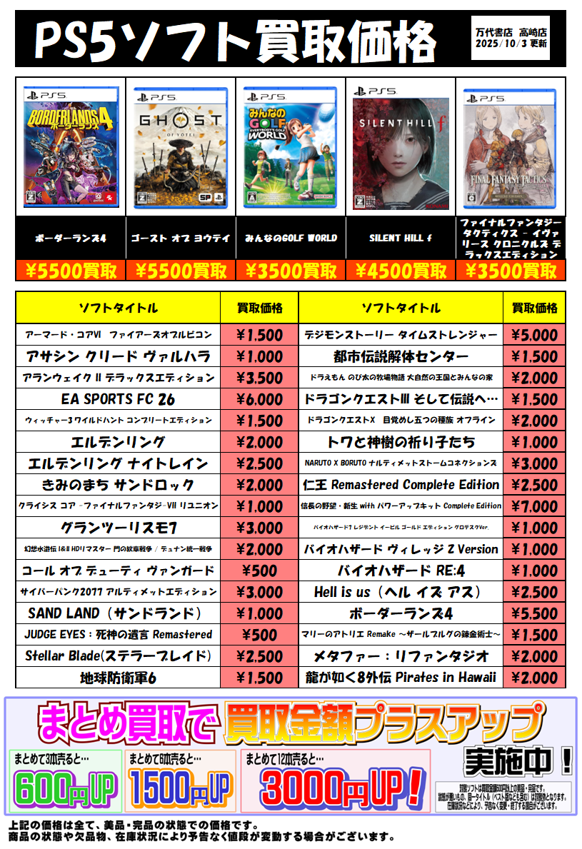 2025.10.03 ゲーム買取 takalab_1 PS5ソフト買取チラシ更新しました! PS5ソフト買取チラシ更新しました! ※2025/10/3現在の価格となります。 在庫状況・状態によってお値段が変動いたします。予めご了承ください。 ************************************** ⇩その他買取情報はこちら⇩ ★万代書店高崎店WEBチラシ★ ⇩最新のイベント情報はこちら⇩ ★万代書店高崎店イベントカレンダー★ コメントを残す コメントをキャンセルメールアドレスが公開されることはありません。 ※ が付いている欄は必須項目ですコメント ※ 名前 ※ メール ※ サイト 新しいコメントをメールで通知 新しい投稿をメールで受け取る Δ