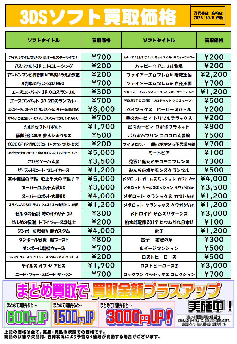 2025.10.08 ゲーム買取 master_takasaki 3DSソフト買取チラシ更新しました! 3DSソフト買取チラシ更新しました! ※2025/10/8現在の価格となります。 在庫状況・状態によってお値段が変動いたします。予めご了承ください。 ************************************** ⇩その他買取情報はこちら⇩ ★万代書店高崎店WEBチラシ★ ⇩最新のイベント情報はこちら⇩ ★万代書店高崎店イベントカレンダー★ コメントを残す コメントをキャンセルメールアドレスが公開されることはありません。 ※ が付いている欄は必須項目ですコメント ※ 名前 ※ メール ※ サイト 新しいコメントをメールで通知 新しい投稿をメールで受け取る Δ