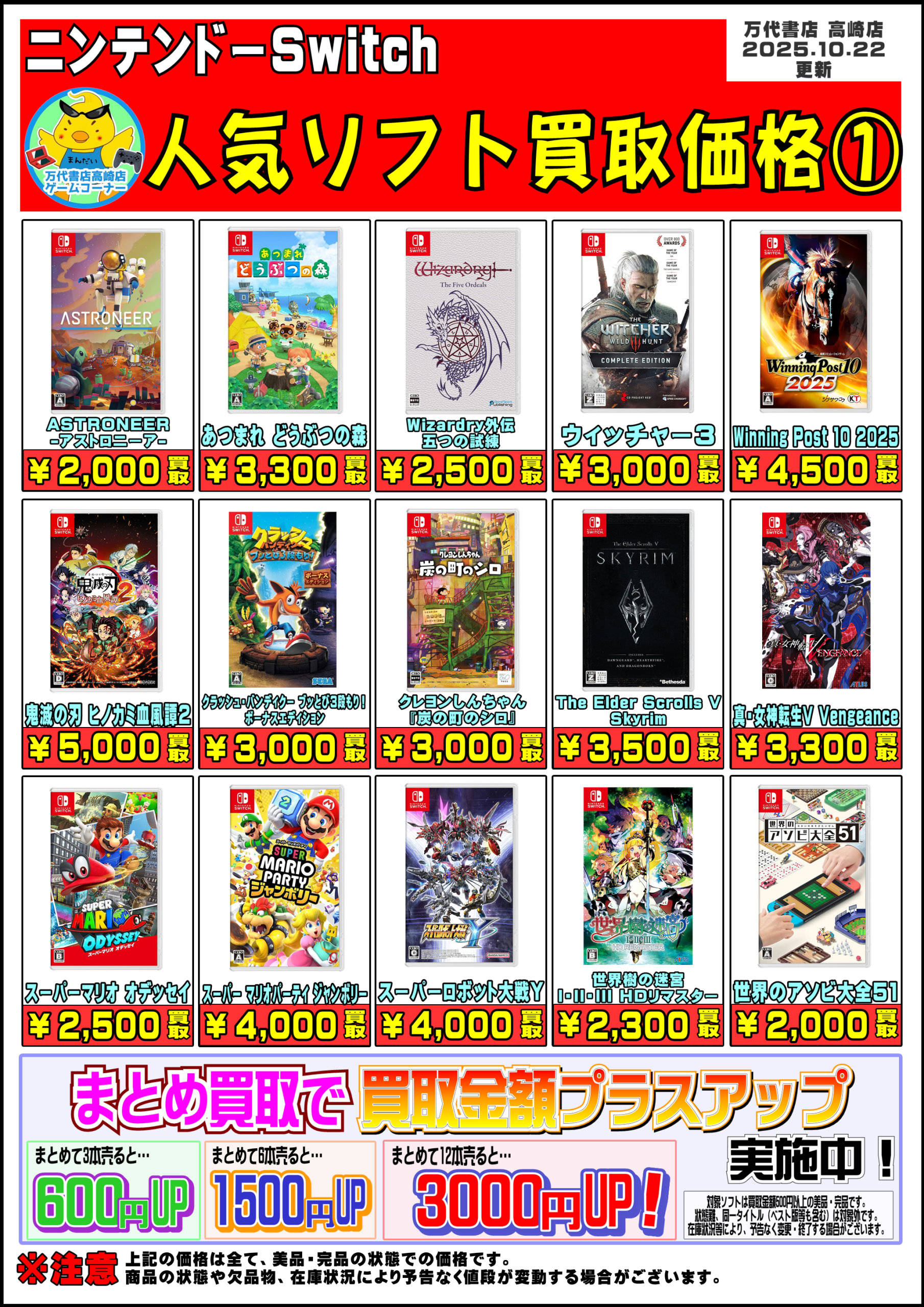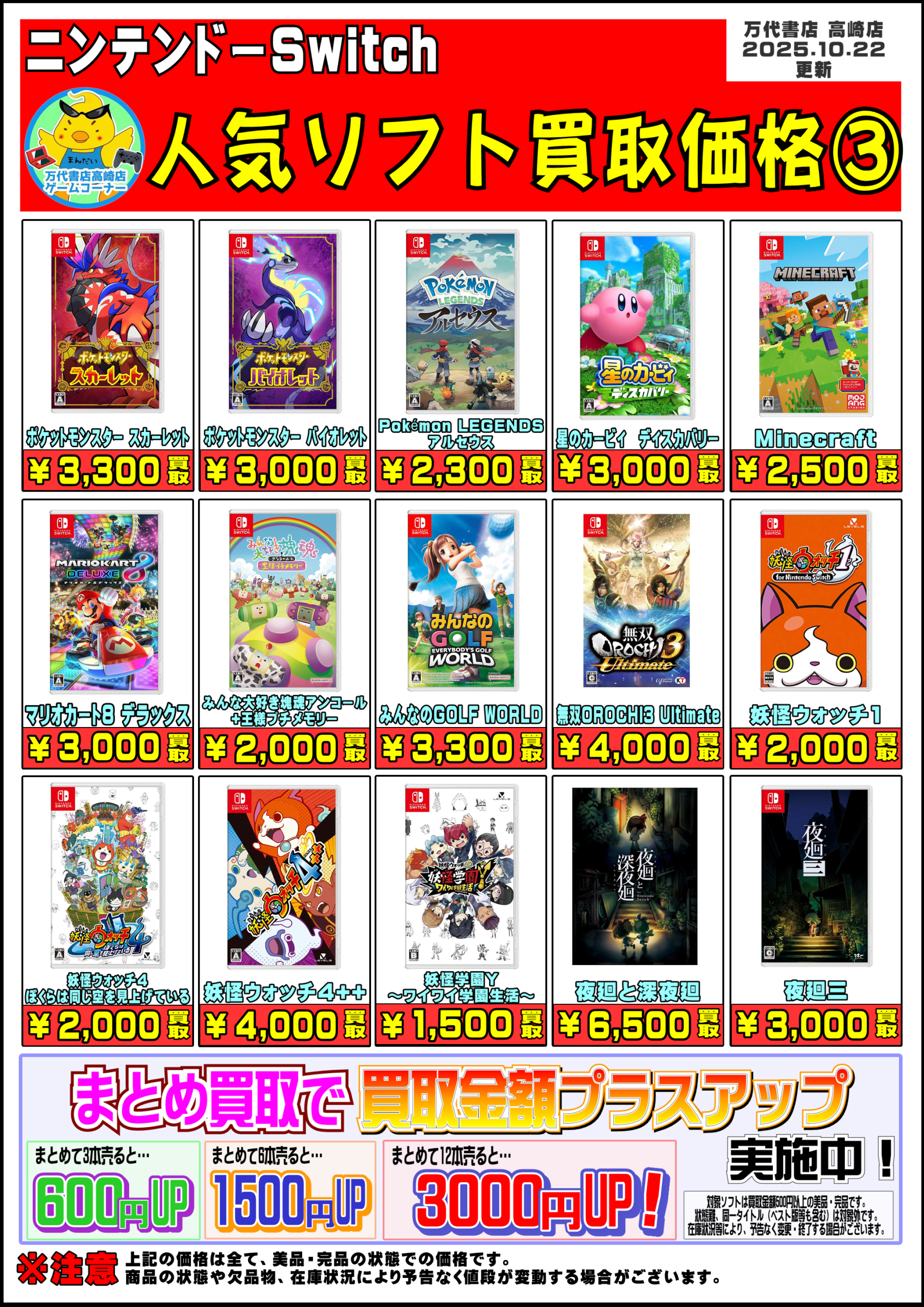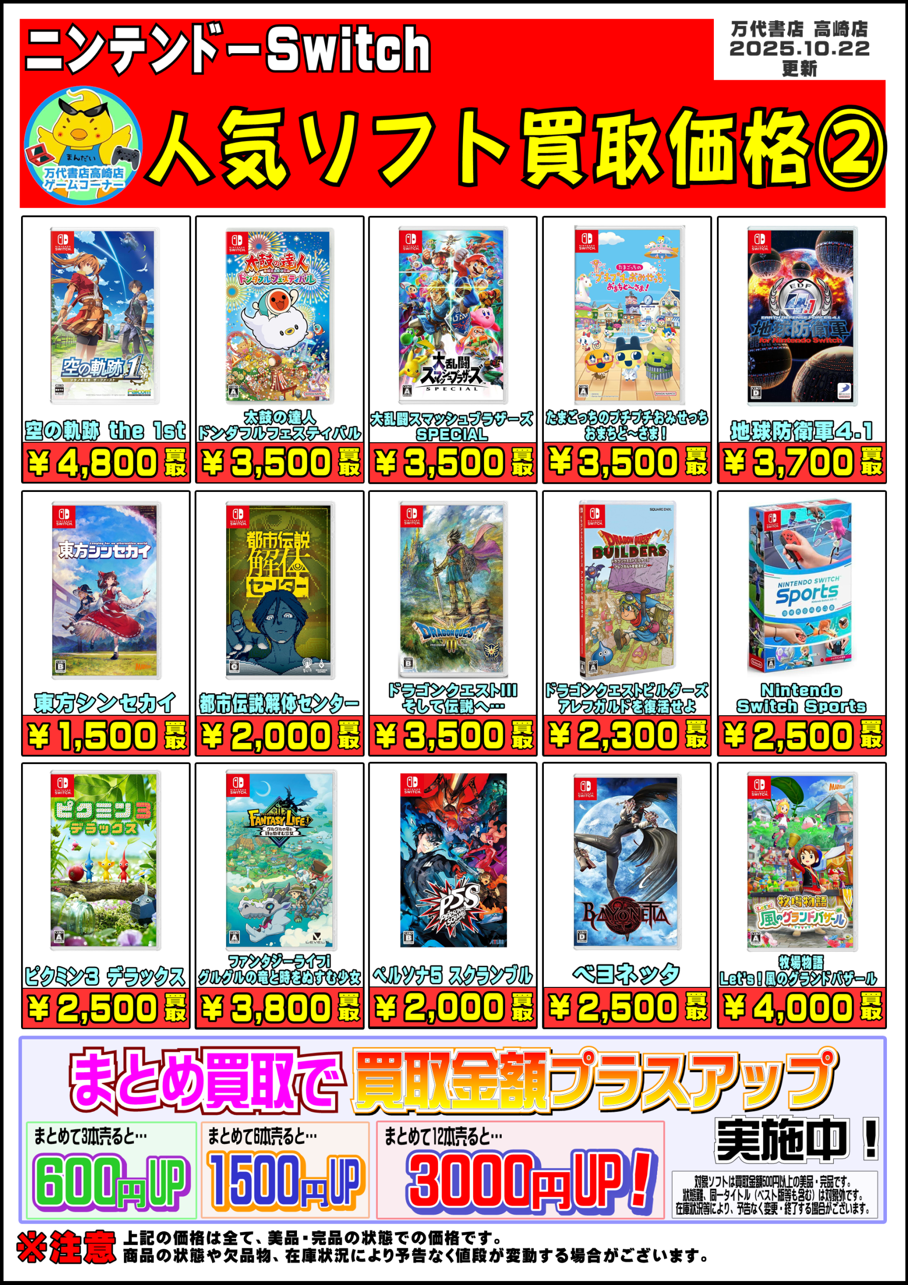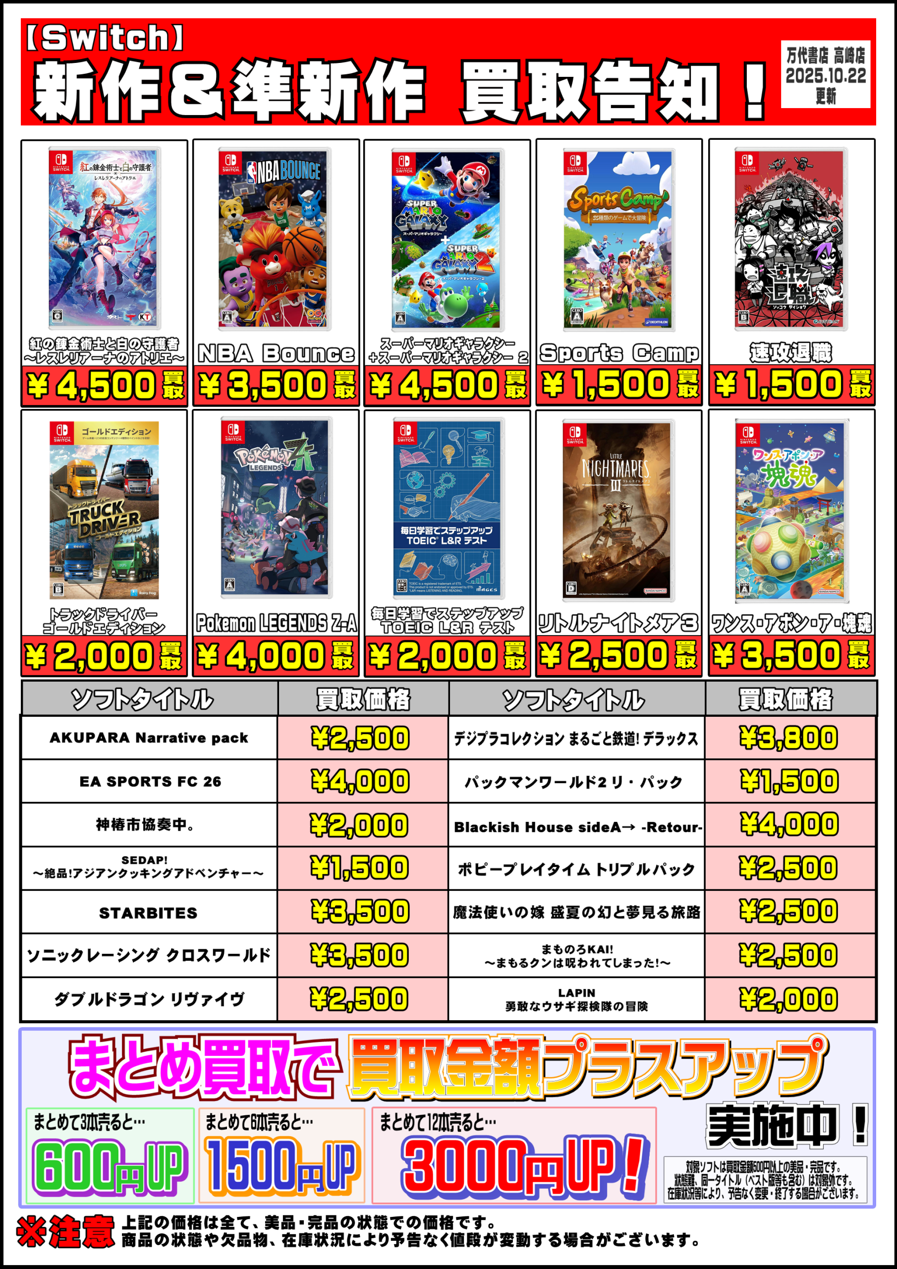 2025.10.23 緊急買取告知! takalab_2 【R7.10.22更新】Switch&Switch2ソフト買取告知、掲載中!■ 【R7.10.22更新】Switch&Switch2ソフト買取告知、掲載中! ※2025/10/23現在の価格となります。 在庫状況・状態によってお値段が変動いたします。予めご了承ください。 ************************************** ⇩その他買取情報はこちら⇩ ★万代書店高崎店WEBチラシ★ ⇩最新のイベント情報はこちら⇩ ★万代書店高崎店イベントカレンダー★ コメントを残す コメントをキャンセルメールアドレスが公開されることはありません。 ※ が付いている欄は必須項目ですコメント ※ 名前 ※ メール ※ サイト 新しいコメントをメールで通知 新しい投稿をメールで受け取る Δ