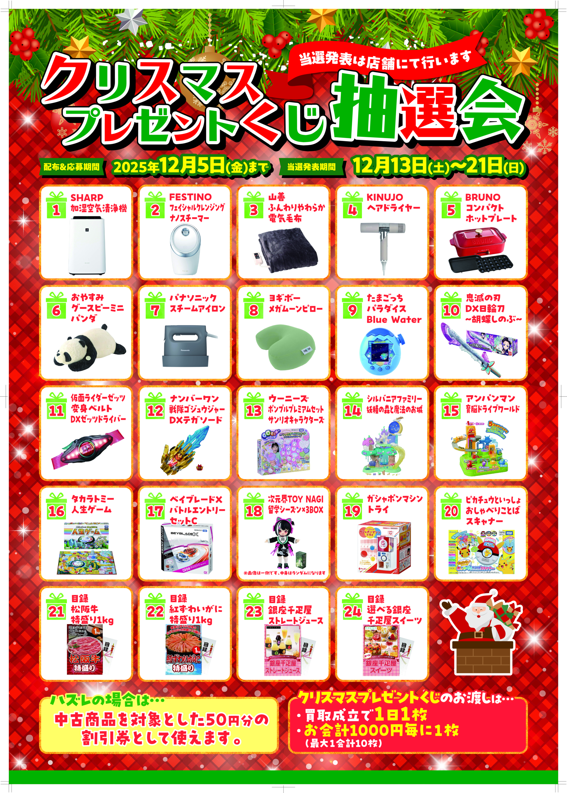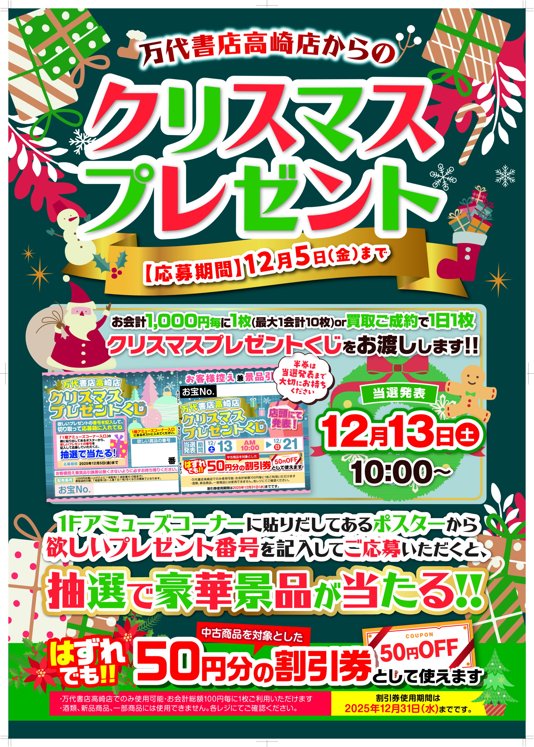 2025.11.04 万代高崎 takalab_6 🎅クリスマスくじ配布中🎅 毎年恒例のクリスマスくじ、 先日より配布中です(≧▽≦)// ほしい景品番号を書いて、応募BOXに入れるだけ! 配布条件は画像の概要を✅ ぜひぜひご参加くださいねー♪ ************************************** ⇩その他買取情報はこちら⇩ ★万代書店高崎店WEBチラシ★ ⇩最新のイベント情報はこちら⇩ ★万代書店高崎店イベントカレンダー★ コメントを残す コメントをキャンセルメールアドレスが公開されることはありません。 ※ が付いている欄は必須項目ですコメント ※ 名前 ※ メール ※ サイト 新しいコメントをメールで通知 新しい投稿をメールで受け取る Δ