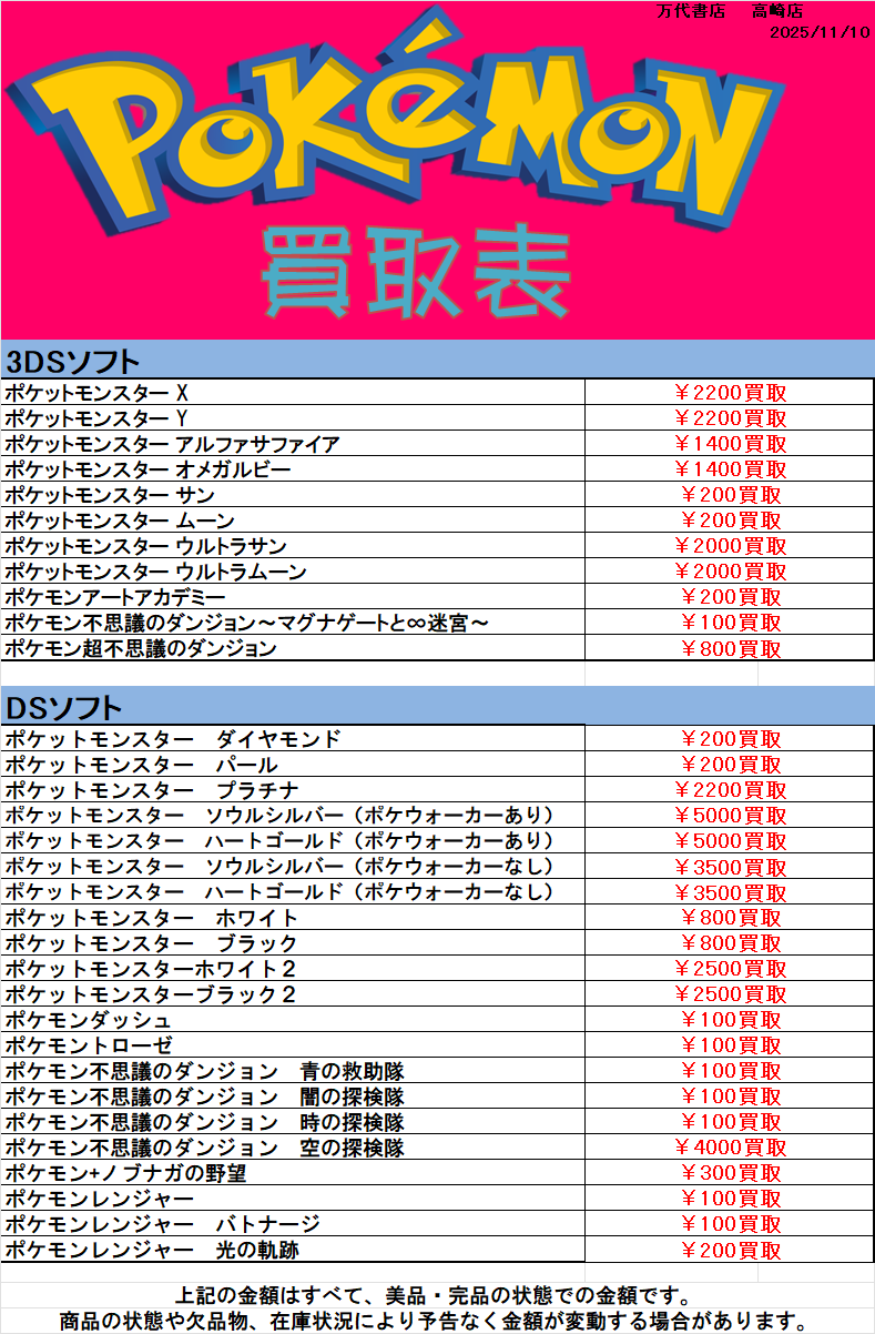 2025.11.10 万代高崎 takalab_6 ◆ポケモン 3DS・DSソフト 買取情報です!◆ 買取情報🎮 ※2025/11/10現在の価格となります。 在庫状況・状態によってお値段が変動いたします。予めご了承ください。 ************************************** ⇩その他買取情報はこちら⇩ ★万代書店高崎店WEBチラシ★ ⇩最新のイベント情報はこちら⇩ ★万代書店高崎店イベントカレンダー★ コメントを残す コメントをキャンセルメールアドレスが公開されることはありません。 ※ が付いている欄は必須項目ですコメント ※ 名前 ※ メール ※ サイト 新しいコメントをメールで通知 新しい投稿をメールで受け取る Δ