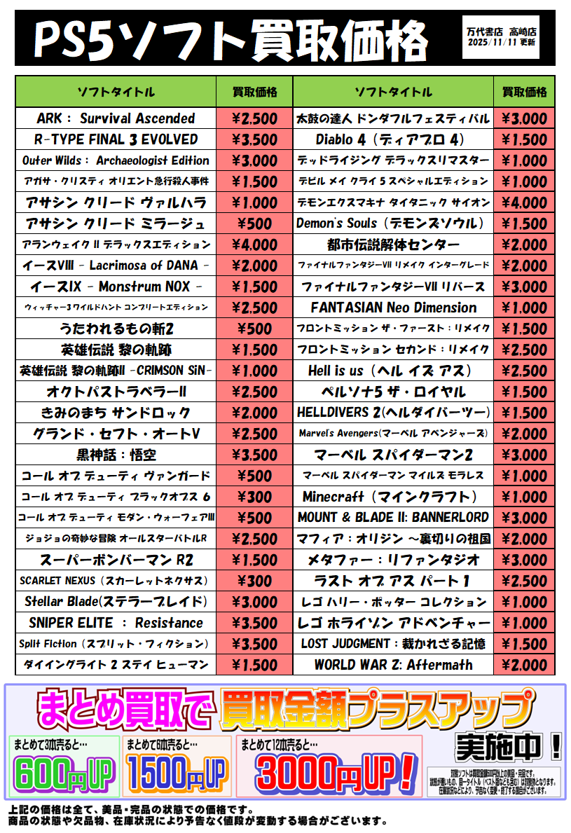 2025.11.11 万代高崎 takalab_6 ◆PS5ソフト買取情報です!◆ ★買取情報★ ※2025/11/11現在の価格となります。 在庫状況・状態によってお値段が変動いたします。予めご了承ください。 ************************************** ⇩その他買取情報はこちら⇩ ★万代書店高崎店WEBチラシ★ ⇩最新のイベント情報はこちら⇩ ★万代書店高崎店イベントカレンダー★ コメントを残す コメントをキャンセルメールアドレスが公開されることはありません。 ※ が付いている欄は必須項目ですコメント ※ 名前 ※ メール ※ サイト 新しいコメントをメールで通知 新しい投稿をメールで受け取る Δ