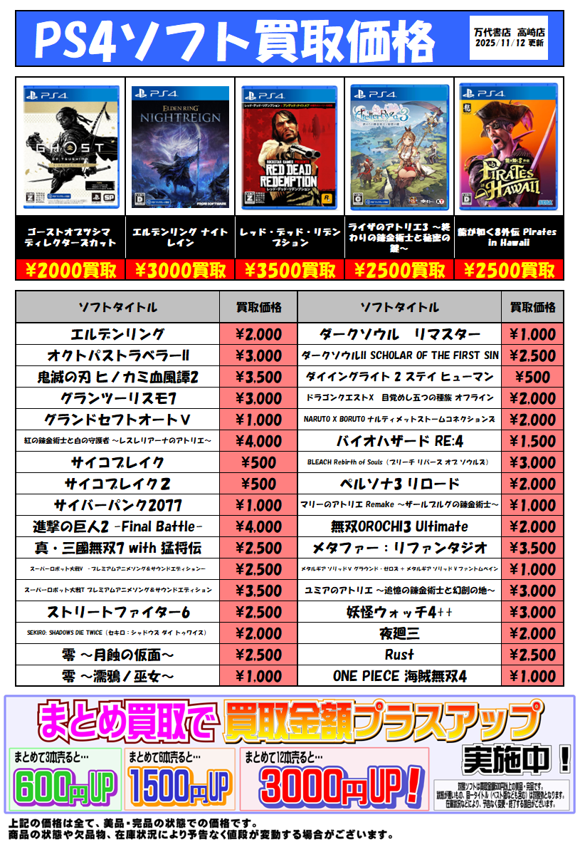 2025.11.12 万代高崎 takalab_5 ◆PS4ソフト買取情報です!◆ ★買取情報★ ※2025/11/12現在の価格となります。 在庫状況・状態によってお値段が変動いたします。予めご了承ください。 ************************************** ⇩その他買取情報はこちら⇩ ★万代書店高崎店WEBチラシ★ ⇩最新のイベント情報はこちら⇩ ★万代書店高崎店イベントカレンダー★ コメントを残す コメントをキャンセルメールアドレスが公開されることはありません。 ※ が付いている欄は必須項目ですコメント ※ 名前 ※ メール ※ サイト 新しいコメントをメールで通知 新しい投稿をメールで受け取る Δ