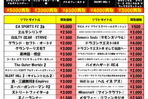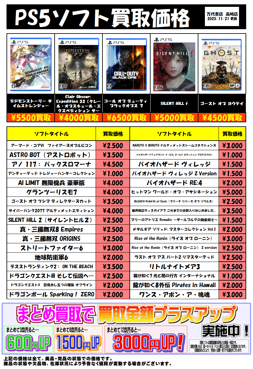2025.11.21 万代高崎 takalab_6 ◆PS5ソフト買取情報です!◆ ★買取情報★ ※2025/11/21現在の価格となります。 在庫状況・状態によってお値段が変動いたします。予めご了承ください。 ************************************** ⇩その他買取情報はこちら⇩ ★万代書店高崎店WEBチラシ★ ⇩最新のイベント情報はこちら⇩ ★万代書店高崎店イベントカレンダー★ コメントを残す コメントをキャンセルメールアドレスが公開されることはありません。 ※ が付いている欄は必須項目ですコメント ※ 名前 ※ メール ※ サイト 新しいコメントをメールで通知 新しい投稿をメールで受け取る Δ