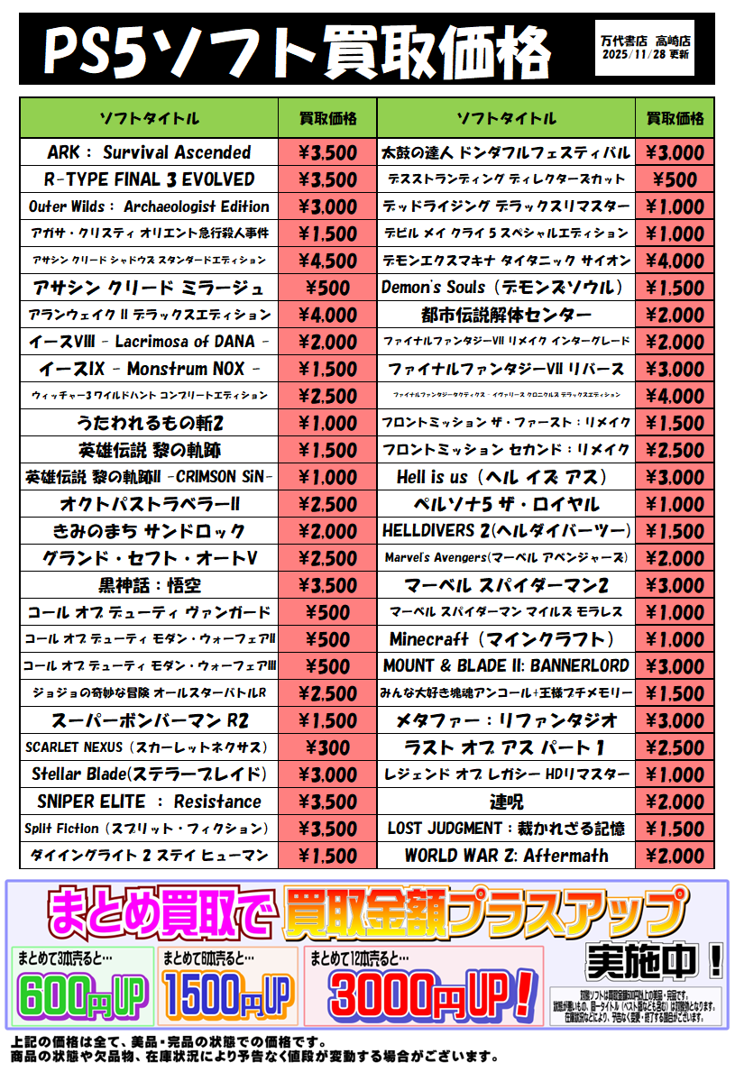 2025.11.28 万代高崎 takalab_6 ◆PS5ソフト買取情報!◆ ★買取情報★ ※2025/11/28現在の価格となります。 在庫状況・状態によってお値段が変動いたします。予めご了承ください。 ************************************** ⇩その他買取情報はこちら⇩ ★万代書店高崎店WEBチラシ★ ⇩最新のイベント情報はこちら⇩ ★万代書店高崎店イベントカレンダー★ コメントを残す コメントをキャンセルメールアドレスが公開されることはありません。 ※ が付いている欄は必須項目ですコメント ※ 名前 ※ メール ※ サイト 新しいコメントをメールで通知 新しい投稿をメールで受け取る Δ