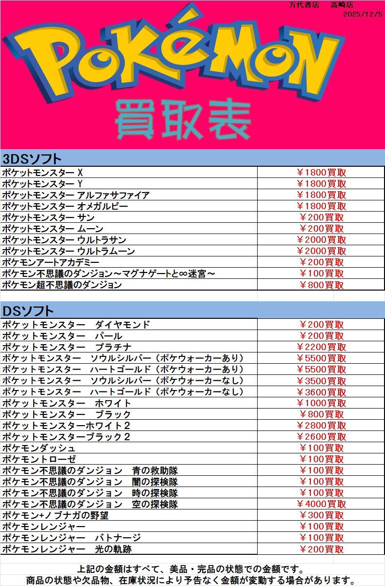 2025.12.05 万代高崎 takalab_5 ◆ポケモン 3DS・DSソフト 買取情報です!◆ 買取情報🎮 ※2025/12/5現在の価格となります。 在庫状況・状態によってお値段が変動いたします。予めご了承ください。 ************************************** ⇩その他買取情報はこちら⇩ ★万代書店高崎店WEBチラシ★ ⇩最新のイベント情報はこちら⇩ ★万代書店高崎店イベントカレンダー★ コメントを残す コメントをキャンセルメールアドレスが公開されることはありません。 ※ が付いている欄は必須項目ですコメント ※ 名前 ※ メール ※ サイト 新しいコメントをメールで通知 新しい投稿をメールで受け取る Δ
