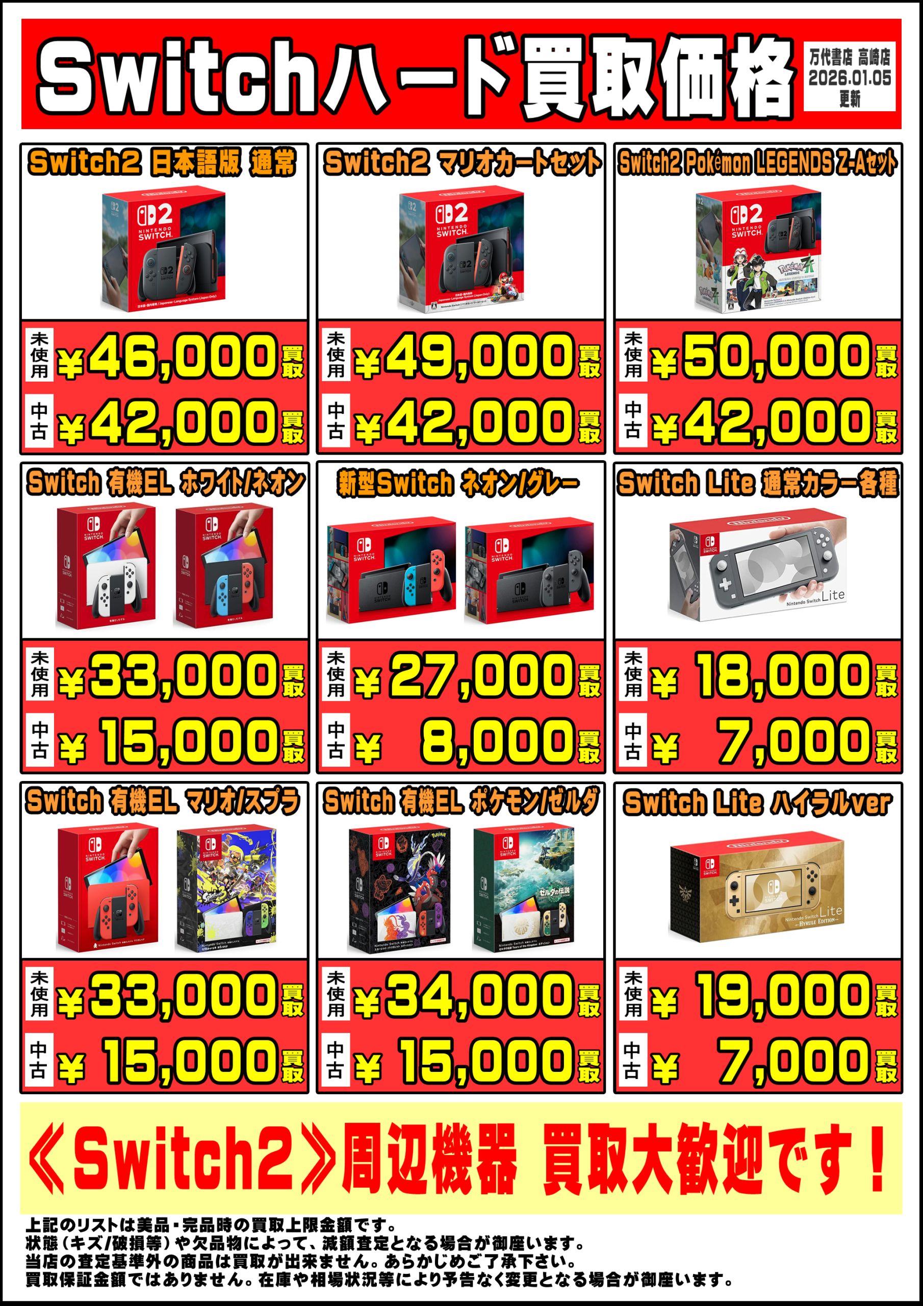 2026.01.06 緊急買取告知! takalab_5 【R8.1.5更新】Switch系本体、買取価格更新しました!!■ 【R8.1.5更新】Switch系本体、買取価格更新しました!! ※2026/1/6現在の価格となります。 在庫状況・状態によってお値段が変動いたします。予めご了承ください。 ************************************** ⇩その他買取情報はこちら⇩ ★万代書店高崎店WEBチラシ★ ⇩最新のイベント情報はこちら⇩ ★万代書店高崎店イベントカレンダー★ コメントを残す コメントをキャンセルメールアドレスが公開されることはありません。 ※ が付いている欄は必須項目ですコメント ※ 名前 ※ メール ※ サイト 新しいコメントをメールで通知 新しい投稿をメールで受け取る Δ