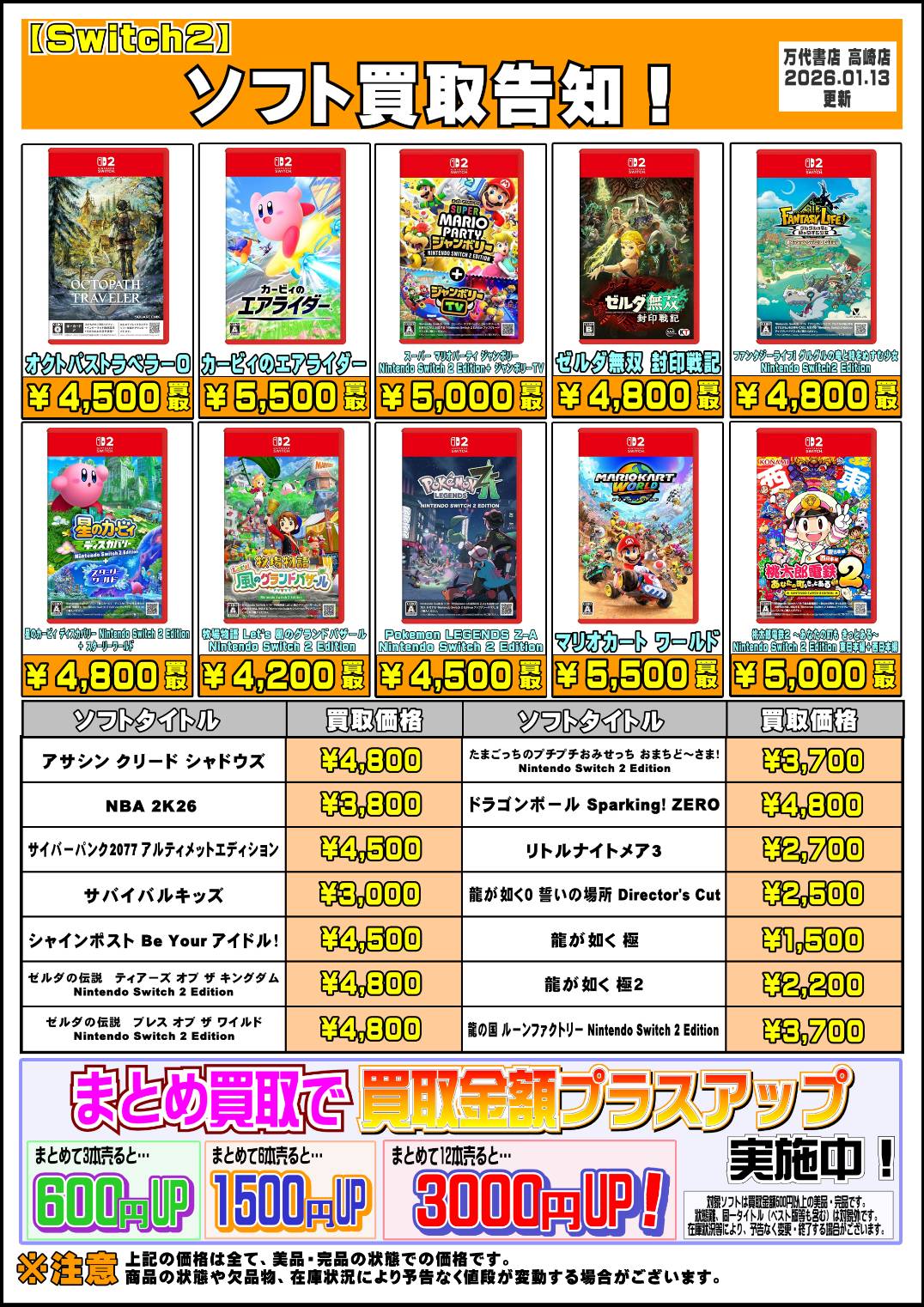 2026.01.14 万代高崎 takalab_6 【R8.1.13更新】Switch2ソフト買取告知、掲載中! 🎮買取情報 ※2026/1/13現在の価格となります。 在庫状況・状態によってお値段が変動いたします。予めご了承ください。 ************************************** ⇩その他買取情報はこちら⇩ ★万代書店高崎店WEBチラシ★ ⇩最新のイベント情報はこちら⇩ ★万代書店高崎店イベントカレンダー★ コメントを残す コメントをキャンセルメールアドレスが公開されることはありません。 ※ が付いている欄は必須項目ですコメント ※ 名前 ※ メール ※ サイト 新しいコメントをメールで通知 新しい投稿をメールで受け取る Δ