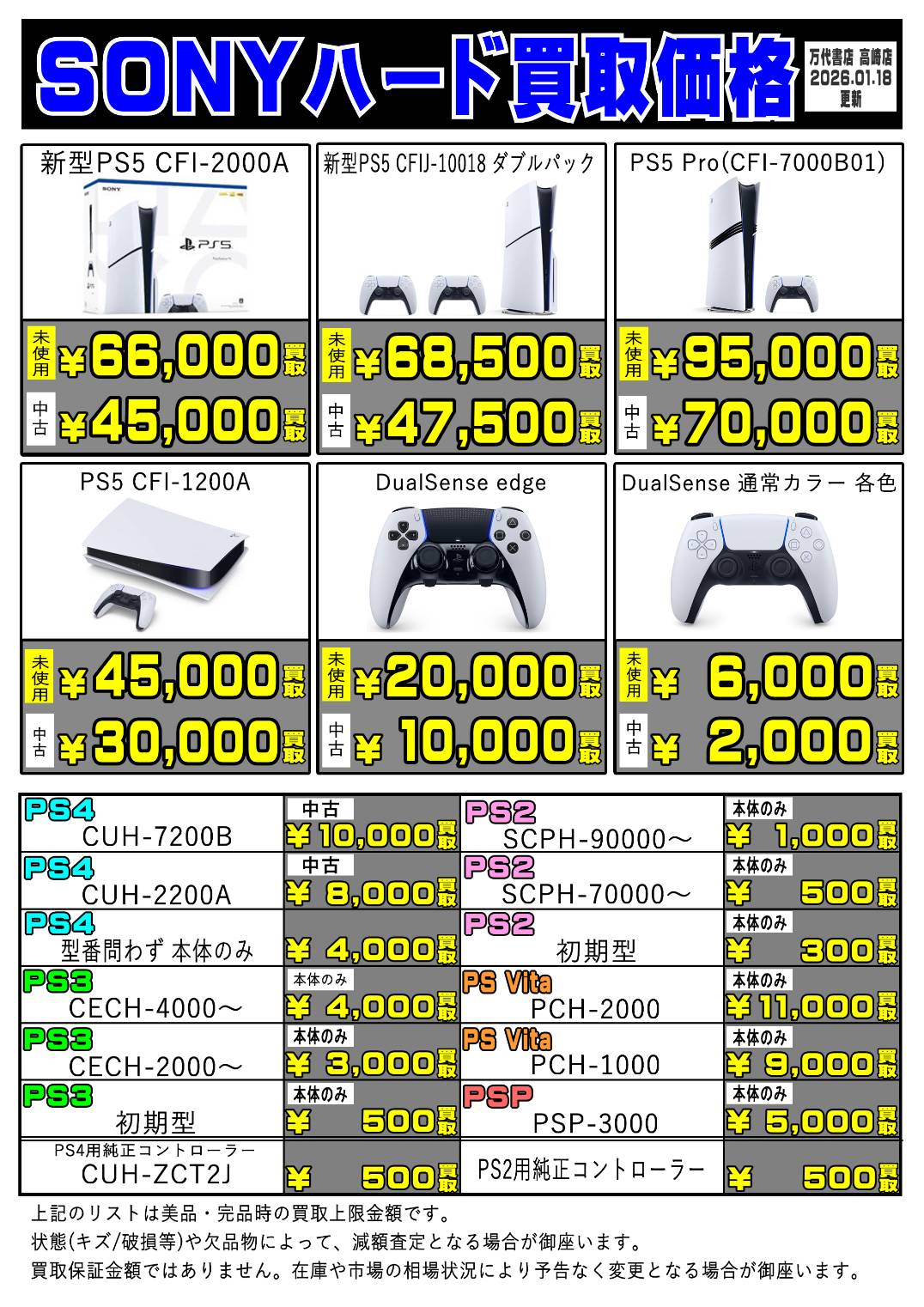 2026.01.19 万代高崎 takalab_6 【R8.1.18更新】SONYハード買取告知、掲載中! SONYハード買取情報🎮📢 ※2026/1/18現在の価格となります。 在庫状況・状態によってお値段が変動いたします。予めご了承ください。 ************************************** ⇩その他買取情報はこちら⇩ ★万代書店高崎店WEBチラシ★ ⇩最新のイベント情報はこちら⇩ ★万代書店高崎店イベントカレンダー★ コメントを残す コメントをキャンセルメールアドレスが公開されることはありません。 ※ が付いている欄は必須項目ですコメント ※ 名前 ※ メール ※ サイト 新しいコメントをメールで通知 新しい投稿をメールで受け取る Δ
