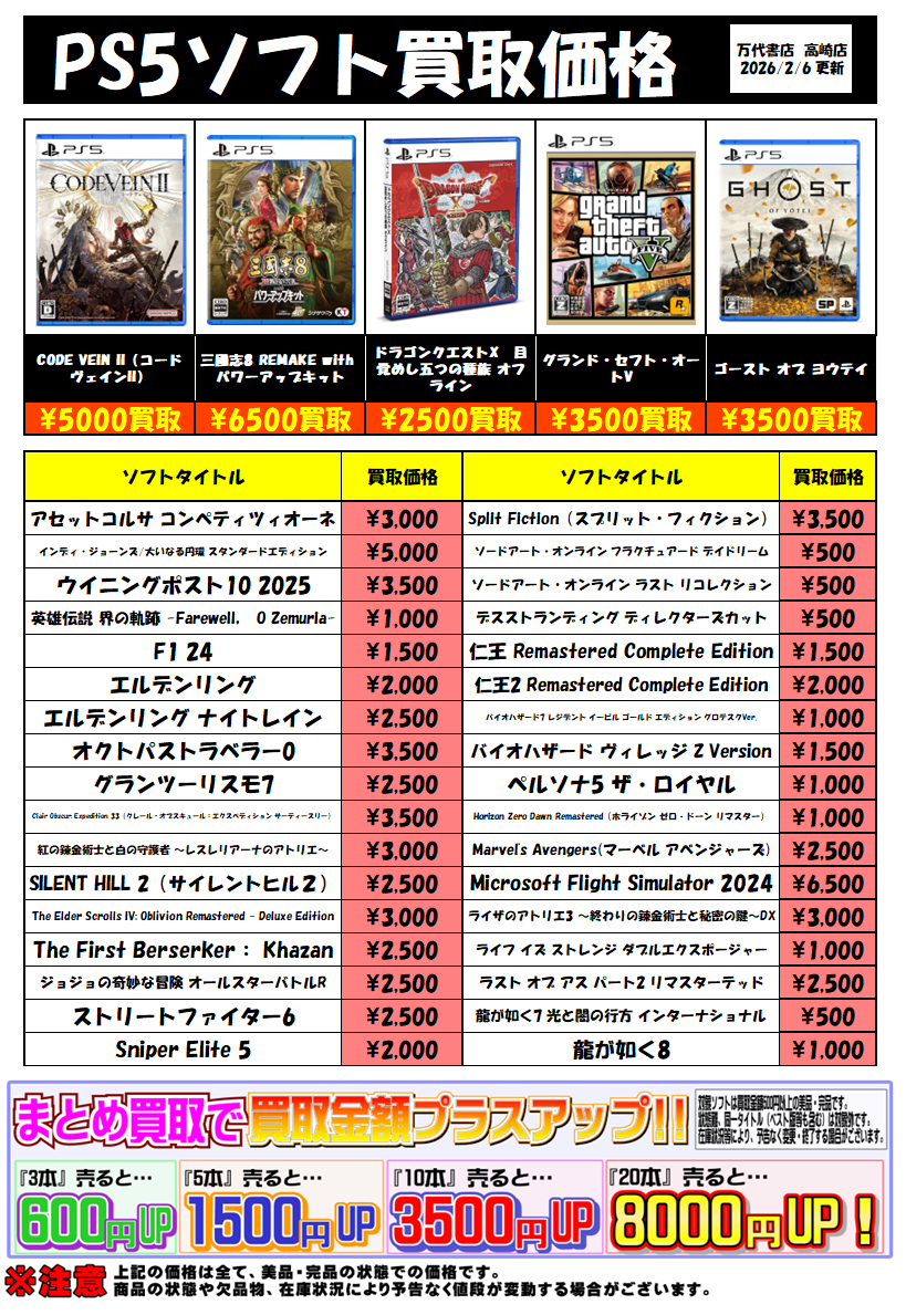 2026.02.06 緊急買取告知! takalab_2 ★PS4&PS5ソフト買取告知★ ★買取情報★ ※2026/2/6現在の価格となります。 在庫状況・状態によってお値段が変動いたします。予めご了承ください。 ************************************** ⇩その他買取情報はこちら⇩ ★万代書店高崎店WEBチラシ★ ⇩最新のイベント情報はこちら⇩ ★万代書店高崎店イベントカレンダー★ コメントを残す コメントをキャンセルメールアドレスが公開されることはありません。 ※ が付いている欄は必須項目ですコメント ※ 名前 ※ メール ※ サイト 新しいコメントをメールで通知 新しい投稿をメールで受け取る Δ