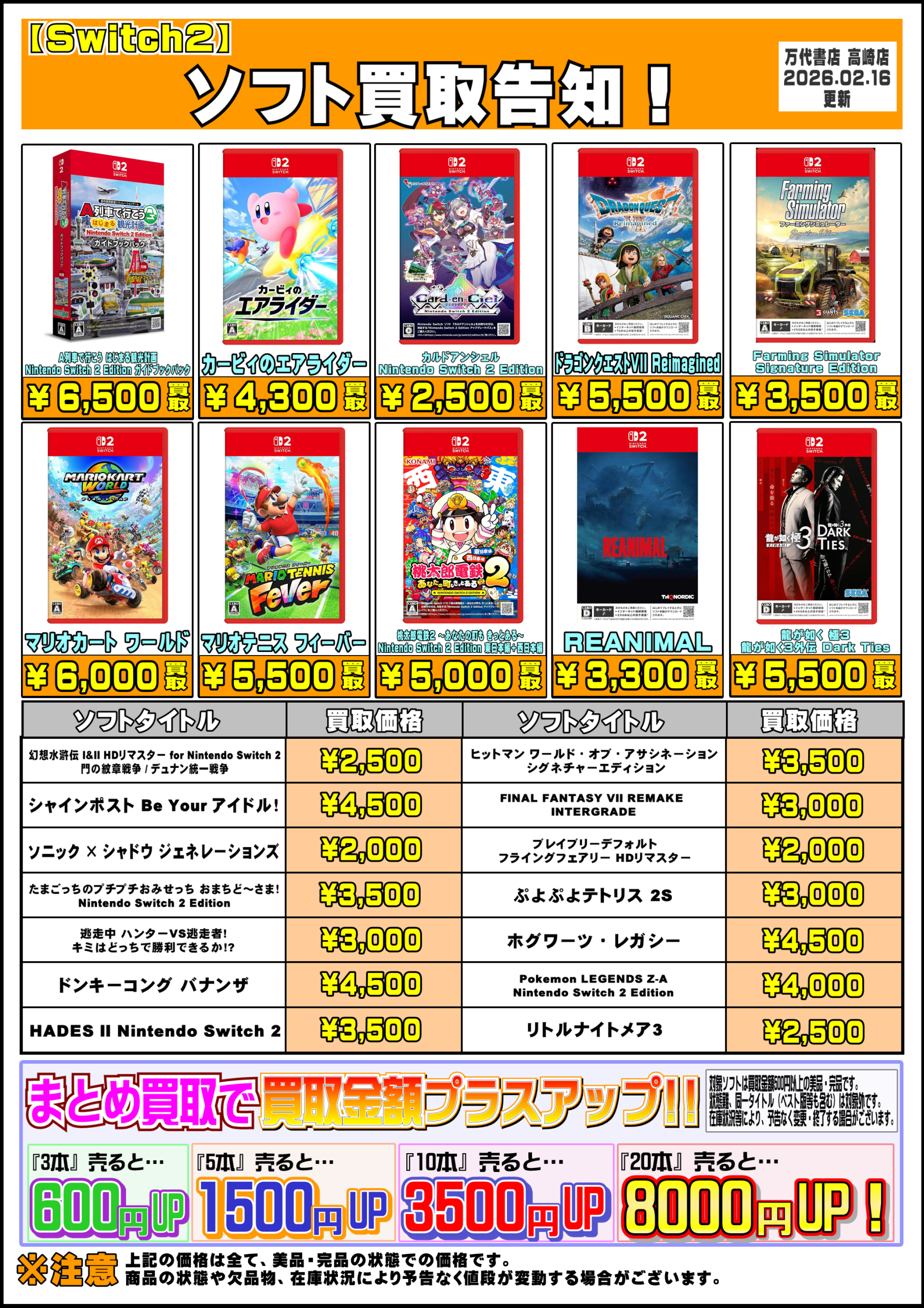 2026.02.17 緊急買取告知! takalab_2 【R8.2.16更新】Switch&Switch2ソフト買取告知、掲載中!■ 【R8.2.16更新】Switch&Switch2ソフト買取告知、掲載中! ※2026/2/17現在の価格となります。 在庫状況・状態によってお値段が変動いたします。予めご了承ください。 ************************************** ⇩その他買取情報はこちら⇩ ★万代書店高崎店WEBチラシ★ ⇩最新のイベント情報はこちら⇩ ★万代書店高崎店イベントカレンダー★ コメントを残す コメントをキャンセルメールアドレスが公開されることはありません。 ※ が付いている欄は必須項目ですコメント ※ 名前 ※ メール ※ サイト 新しいコメントをメールで通知 新しい投稿をメールで受け取る Δ