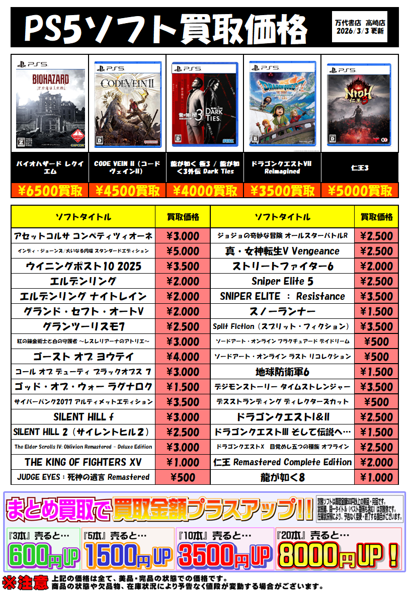 2026.03.03 ゲーム買取 takalab_1 PS5ソフト買取価格更新しました! PS5ソフト買取価格更新しました! ※2026/3/3現在の価格となります。 在庫状況・状態によってお値段が変動いたします。予めご了承ください。 ************************************** ⇩その他買取情報はこちら⇩ ★万代書店高崎店WEBチラシ★ ⇩最新のイベント情報はこちら⇩ ★万代書店高崎店イベントカレンダー★ コメントを残す コメントをキャンセルメールアドレスが公開されることはありません。 ※ が付いている欄は必須項目ですコメント ※ 名前 ※ メール ※ サイト 新しいコメントをメールで通知 新しい投稿をメールで受け取る Δ