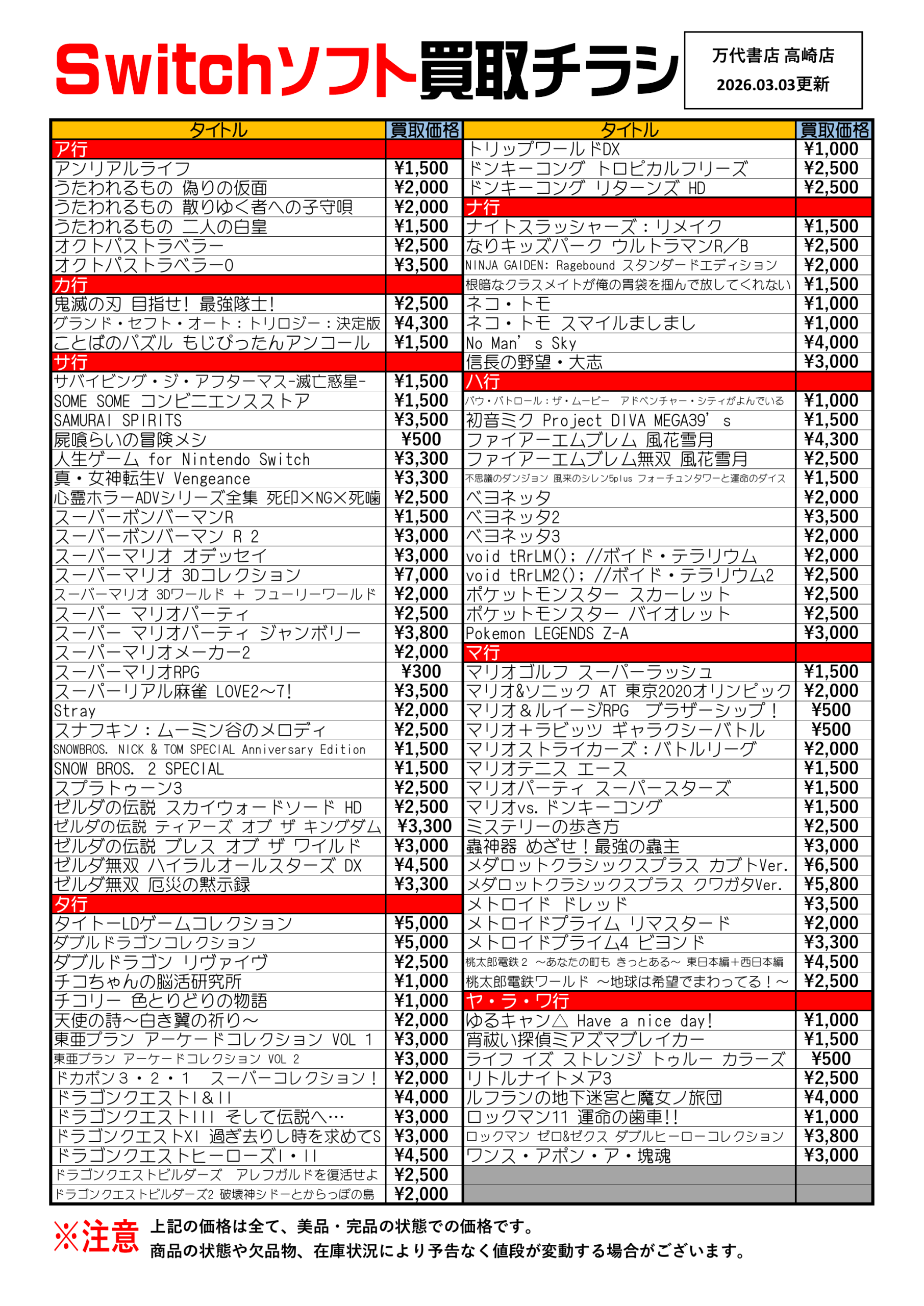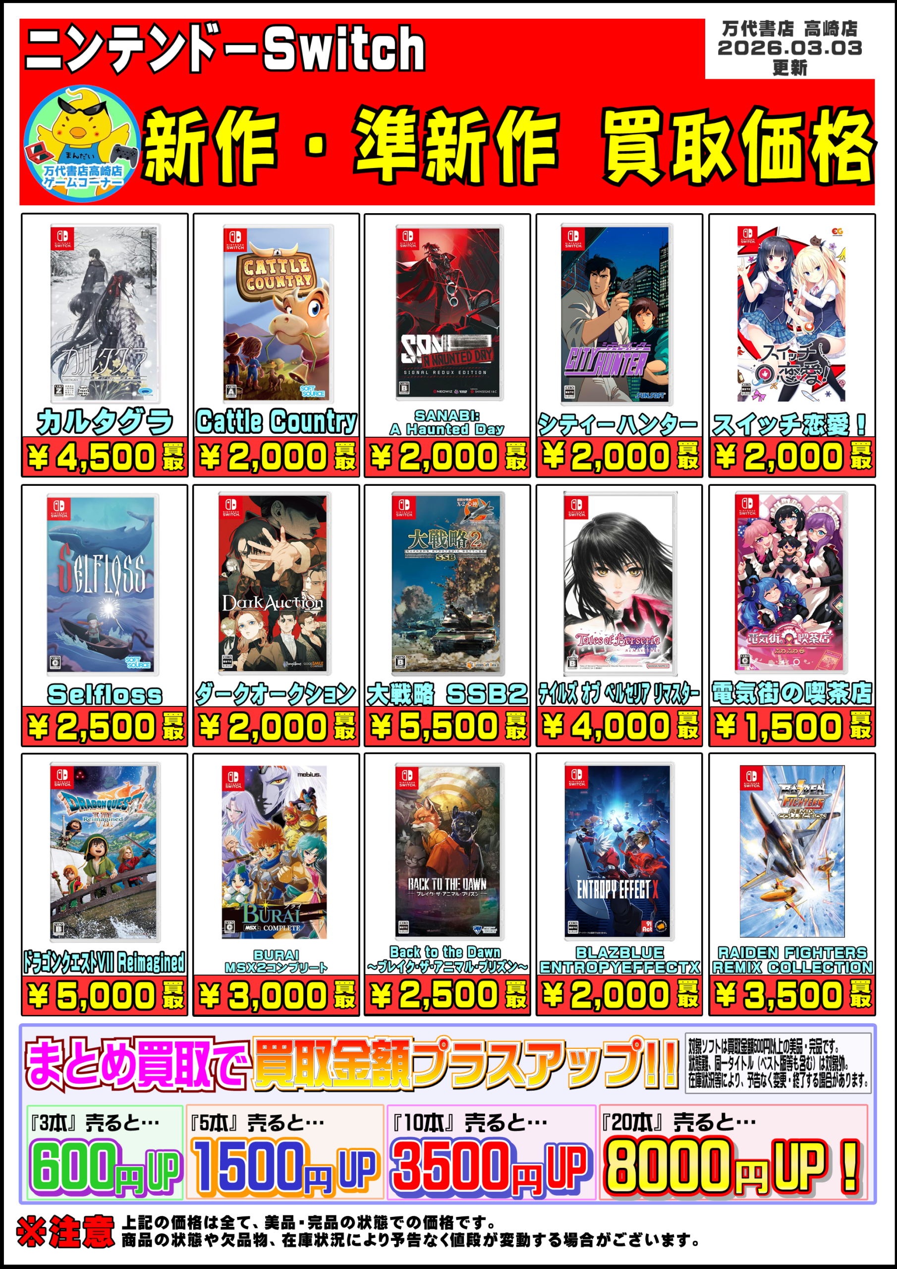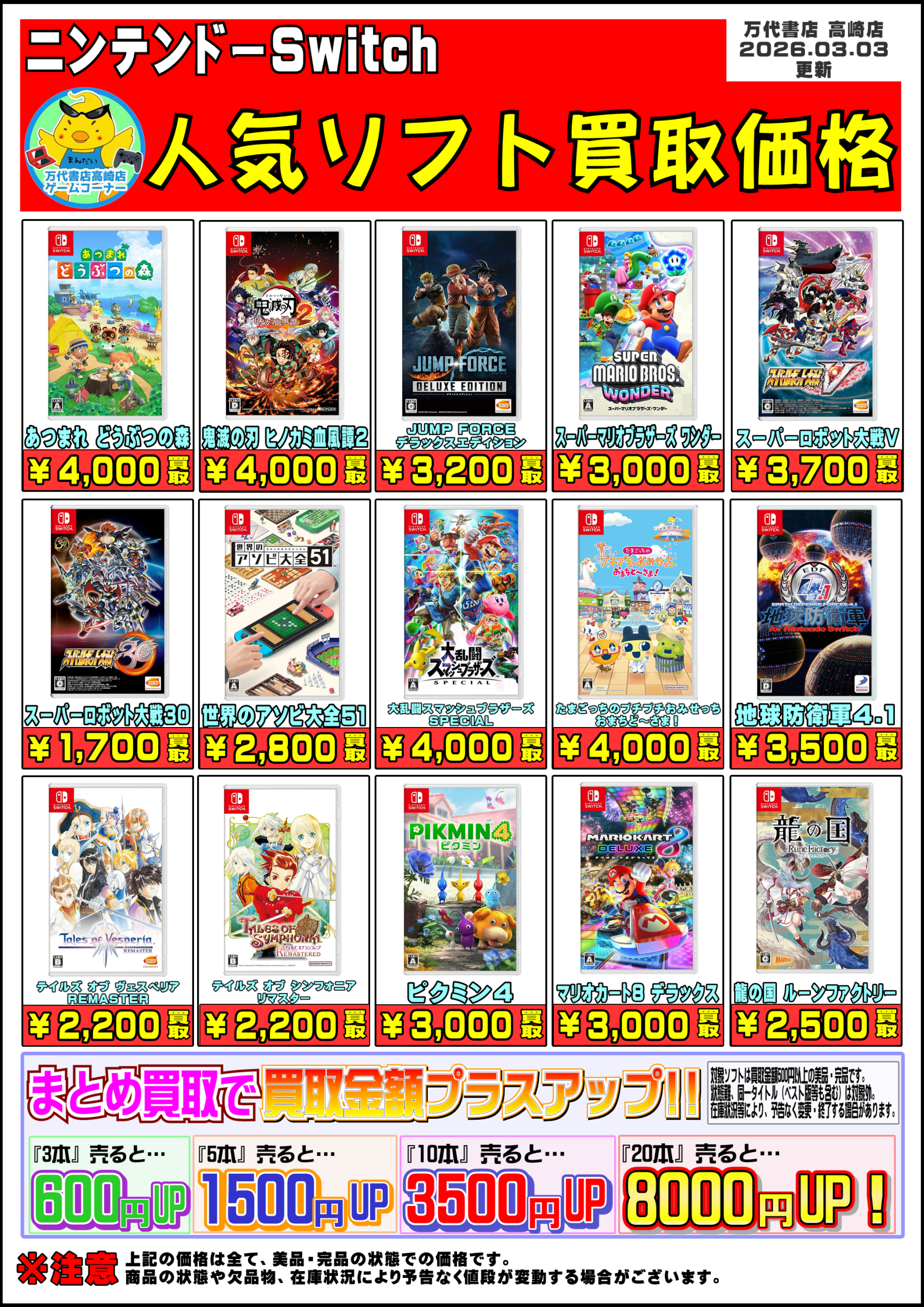 2026.03.04 万代高崎 takalab_6 【R8.3.3更新】Switchソフト買取告知、掲載中! Switchソフト買取告知掲載中! ※2026/3/3現在の価格となります。 在庫状況・状態によってお値段が変動いたします。予めご了承ください。 ************************************** ⇩その他買取情報はこちら⇩ ★万代書店高崎店WEBチラシ★ ⇩最新のイベント情報はこちら⇩ ★万代書店高崎店イベントカレンダー★ コメントを残す コメントをキャンセルメールアドレスが公開されることはありません。 ※ が付いている欄は必須項目ですコメント ※ 名前 ※ メール ※ サイト 新しいコメントをメールで通知 新しい投稿をメールで受け取る Δ