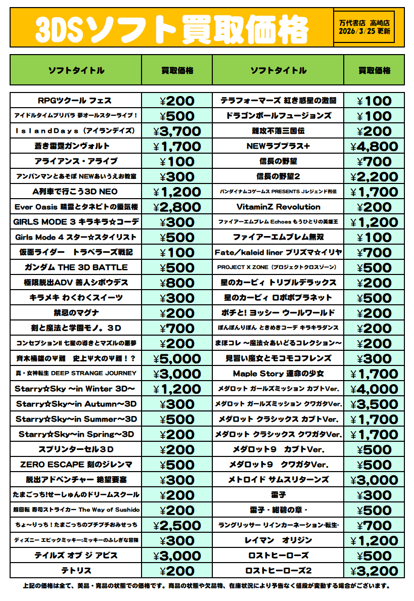 2026.03.25 レトロゲーム takalab_6 3ds買取一覧表更新しました! ★買取情報★ ※2026/3/25現在の価格となります。 在庫状況・状態によってお値段が変動いたします。予めご了承ください。 ************************************** ⇩その他買取情報はこちら⇩ ★万代書店高崎店WEBチラシ★ ⇩最新のイベント情報はこちら⇩ ★万代書店高崎店イベントカレンダー★ コメントを残す コメントをキャンセルメールアドレスが公開されることはありません。 ※ が付いている欄は必須項目ですコメント ※ 名前 ※ メール ※ サイト 新しいコメントをメールで通知 新しい投稿をメールで受け取る Δ