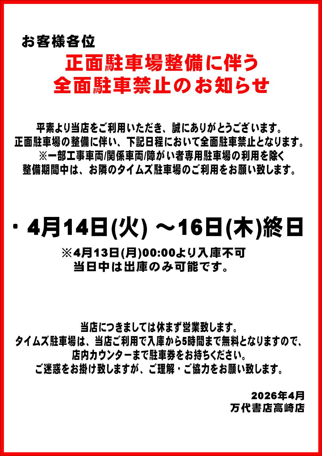 2026.04.06 お知らせ takalab_4 【正面駐車場整備に伴う、駐車禁止期間のお知らせ】 ★お知らせ★ ************************************** ⇩その他買取情報はこちら⇩ ★万代書店高崎店WEBチラシ★ ⇩最新のイベント情報はこちら⇩ ★万代書店高崎店イベントカレンダー★ コメントを残す コメントをキャンセルメールアドレスが公開されることはありません。 ※ が付いている欄は必須項目ですコメント ※ 名前 ※ メール ※ サイト 新しいコメントをメールで通知 新しい投稿をメールで受け取る Δ