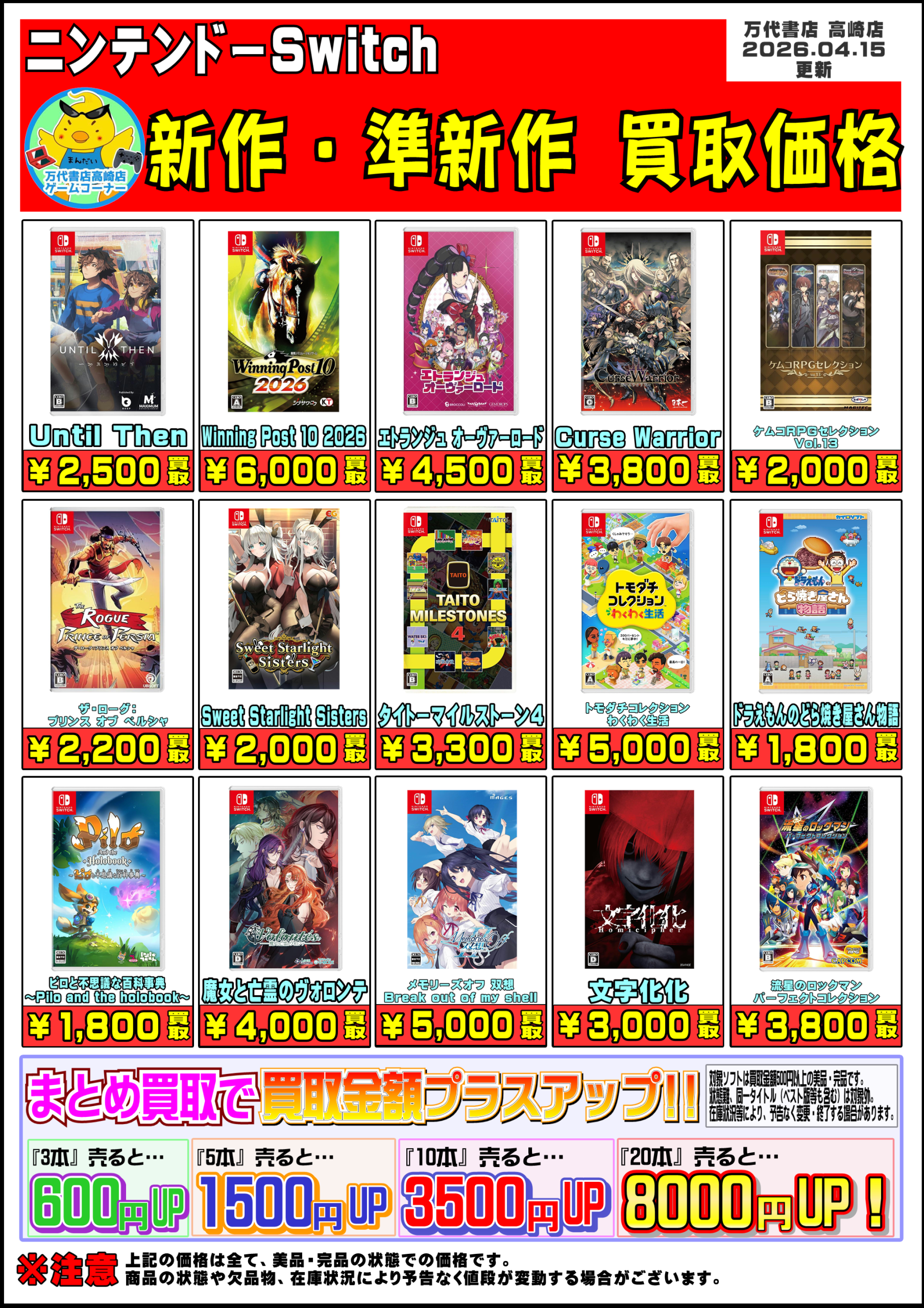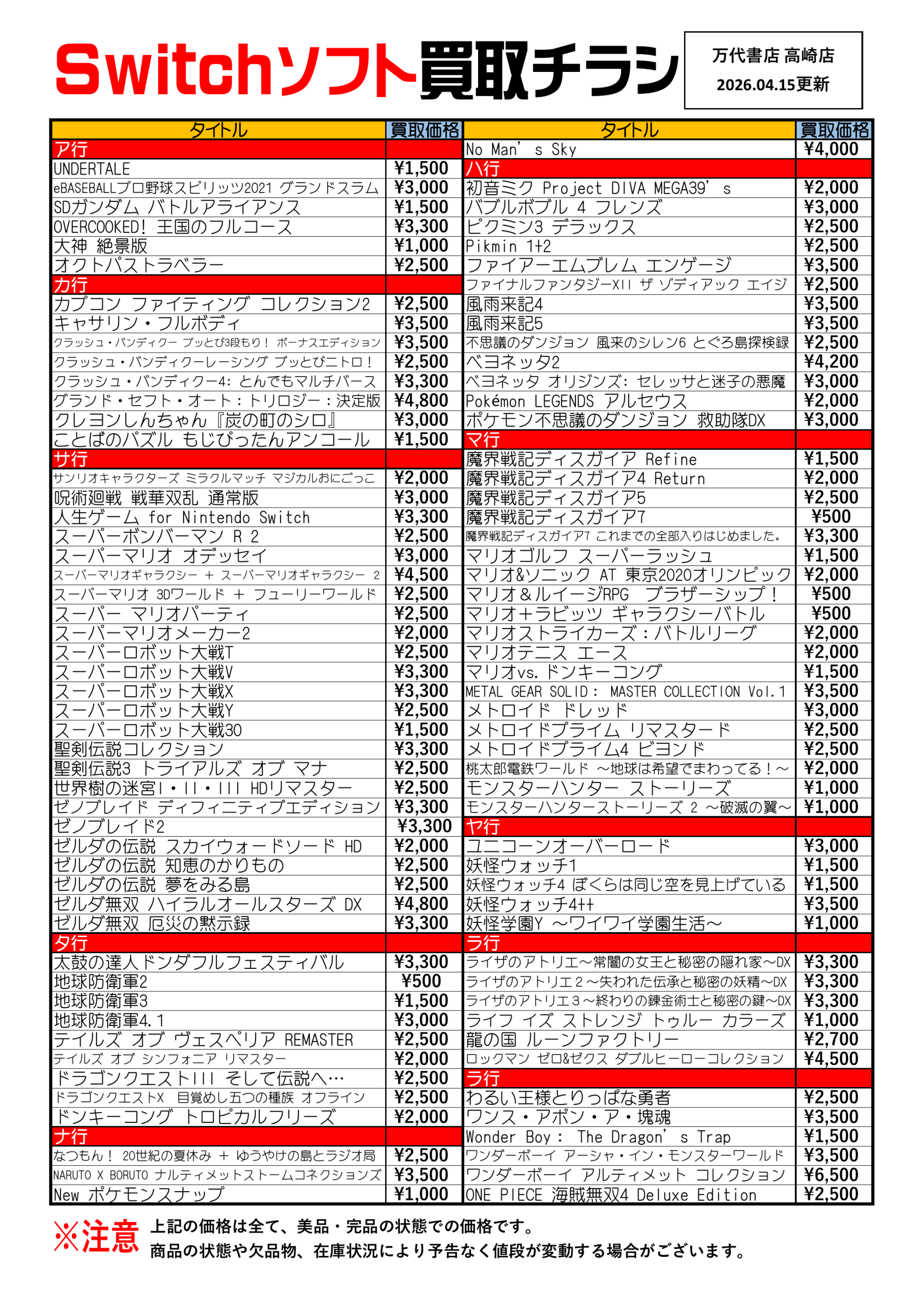 2026.04.15 緊急買取告知! takalab_2 【R8.4.15更新】Switch & Switch2ソフト買取告知、掲載中!■ 【R8.4.15更新】Switch & Switch2ソフト買取告知、掲載中! ※2026/4/15現在の価格となります。 在庫状況・状態によってお値段が変動いたします。予めご了承ください。 ************************************** ⇩その他買取情報はこちら⇩ ★万代書店高崎店WEBチラシ★ ⇩最新のイベント情報はこちら⇩ ★万代書店高崎店イベントカレンダー★ コメントを残す コメントをキャンセルメールアドレスが公開されることはありません。 ※ が付いている欄は必須項目ですコメント ※ 名前 ※ メール ※ サイト 新しいコメントをメールで通知 新しい投稿をメールで受け取る Δ