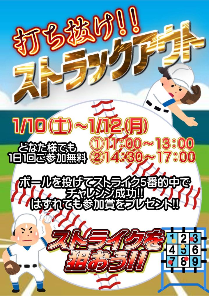 今週末のイベントは、 【打ち抜け!ストラックアウト】です!! 開催場所:1階フロア 開催日程:1/10(土)~1/12(月) 開催時間:11:00~13:00 14:30〜17:00 どなた様も、1日1回ご参加いただけ…