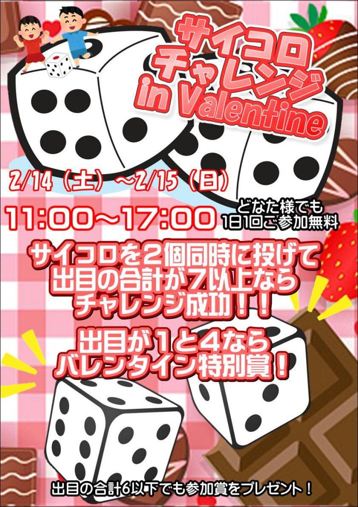 今週末は、【サイコロチャレンジ】です💡 今回はバレンタイン仕様😻 特別賞をご用意しました🍫🍫🍫 どなた様も参加可能です🫡 ご…