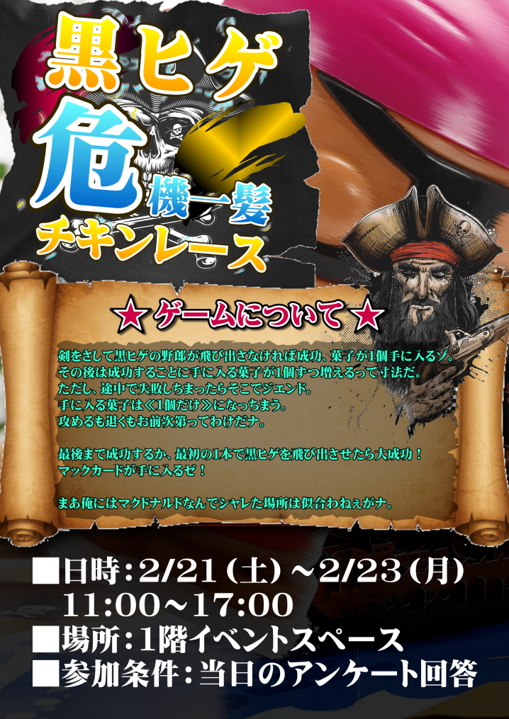 今週末の3連休は、黒ひげチキンレース開催です🎉 ※当日アンケートのご回答が参加条件となります。 天国か地獄か・・・・ 自分の直観&勇気が試されるゲームです! 挑戦者求ム!!!😎  …