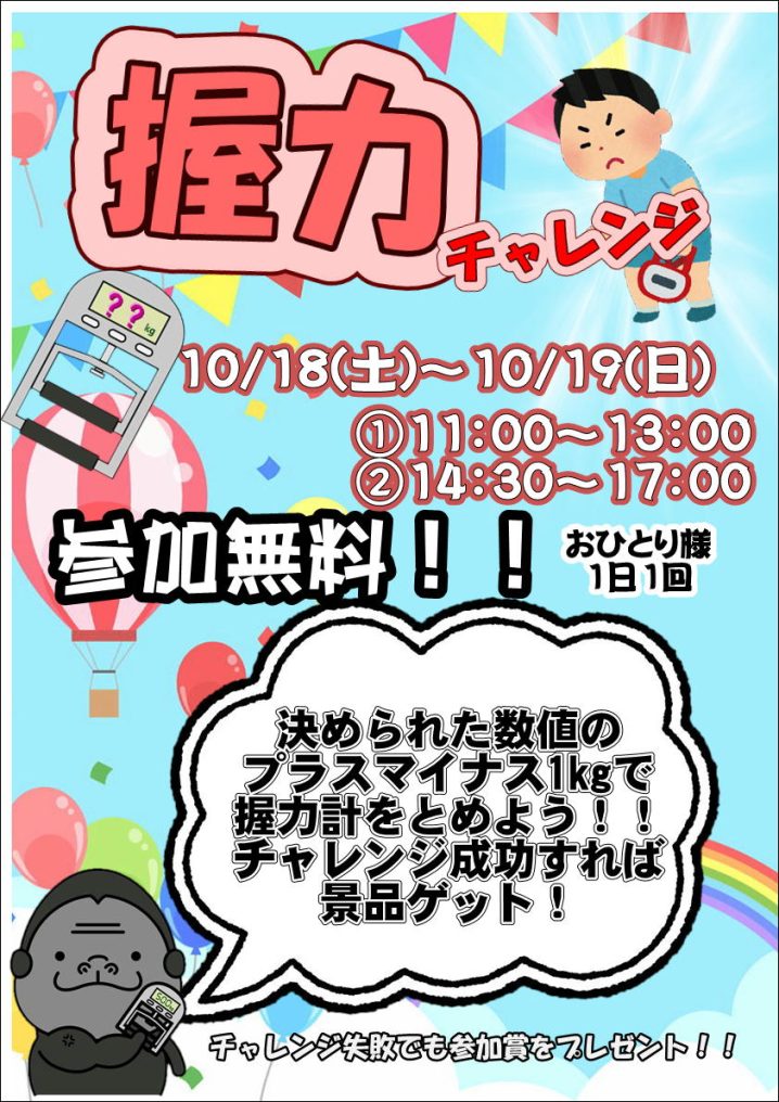 ★握力チャレンジ開催★ 10月18日(土)から19日(日)に、握力チャレンジイベントを開催いたします☆ 決められた数値±1kg以内でとめられればチャレンジ成功、景品がGETできます! 参加費は無料なのでぜひお気軽にご参加…