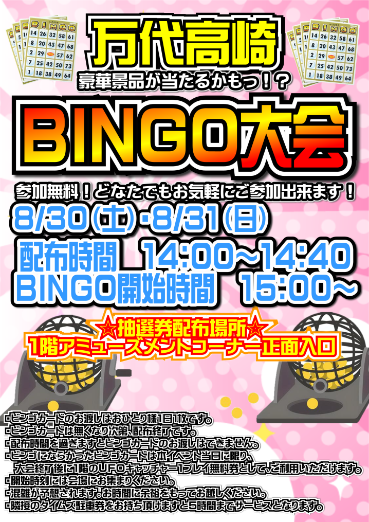 今週末は 【BINGO大会】開催!! 開催場所:1階フロア 開催日程:8/30(土)~8/31(日) 配布時間:14:00~14:40 開始時間:15:00~ どなた様も1日1枚お渡し!! 8月最後の週末イベント、 ぜ…