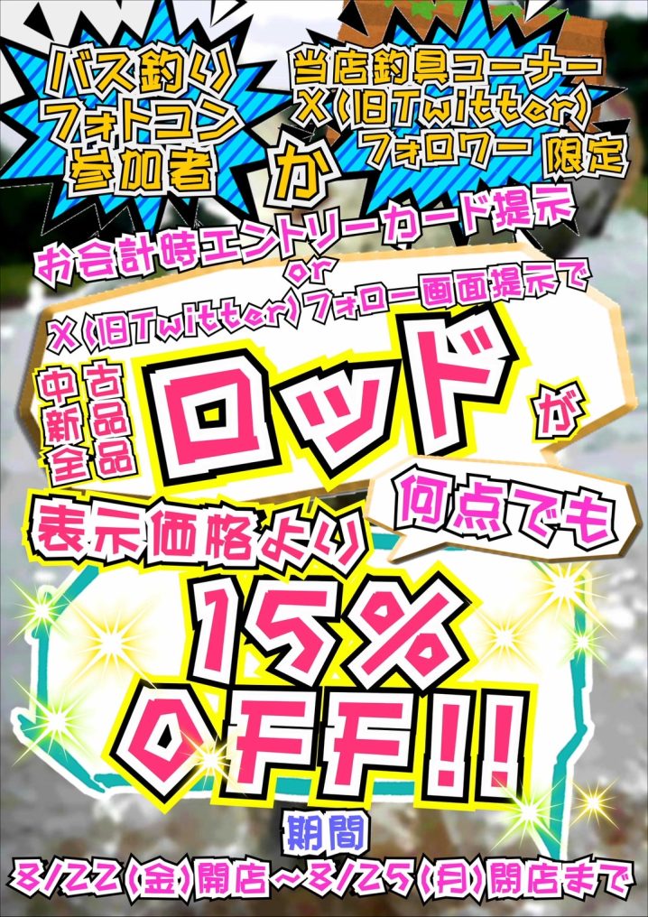 釣具イベント 8月バス釣りフォトコン参加者&Xフォロワー特典 8/22(金)〜8/25(月)閉店まで ロッド全品15%OFF❗️を開催します‼️ バスロッド、トラウ…