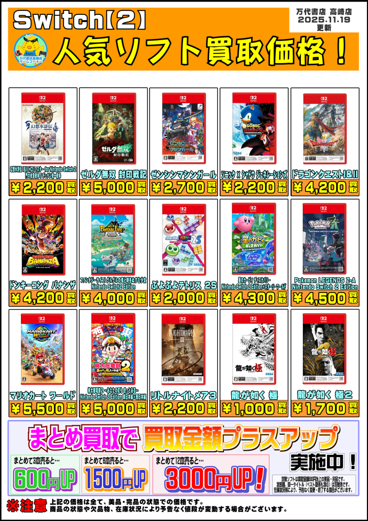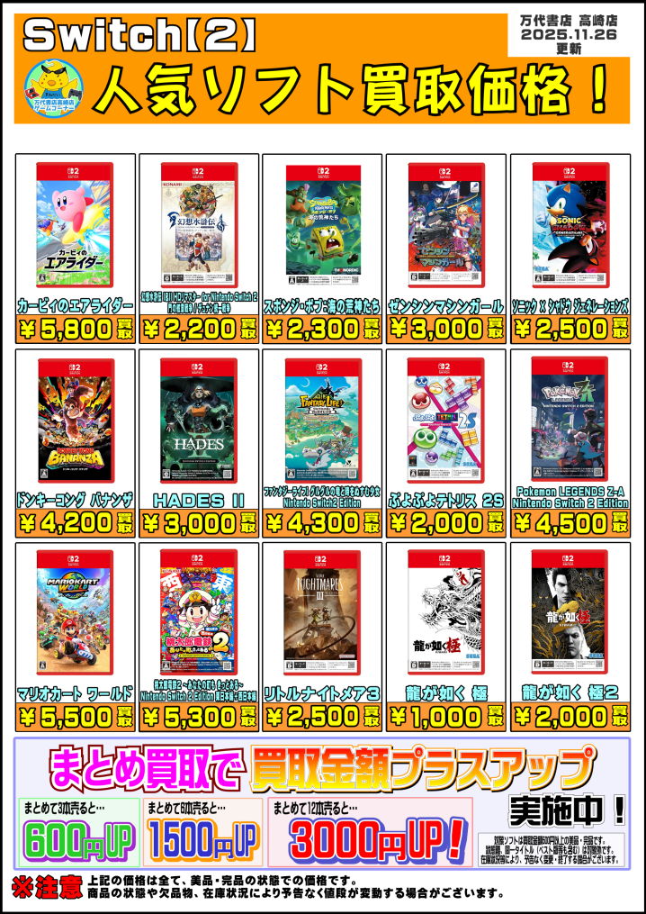 ★Switch&Switch2ソフト買取情報★ ※2025/11/27現在の価格となります。 在庫状況・状態によってお値段が変動いたします。予めご了承ください。 *************************…