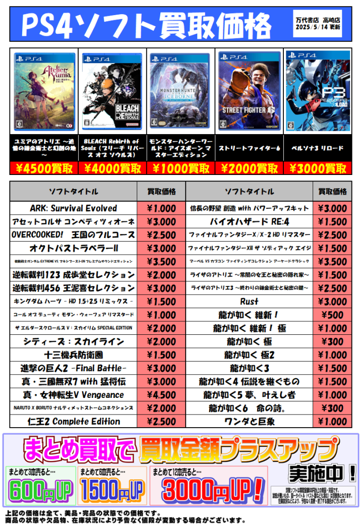 PS4ソフト買取チラシ更新しました! ※2025/5/14現在の価格となります。 在庫状況・状態によってお値段が変動いたします。予めご了承ください。 ***********************************…
