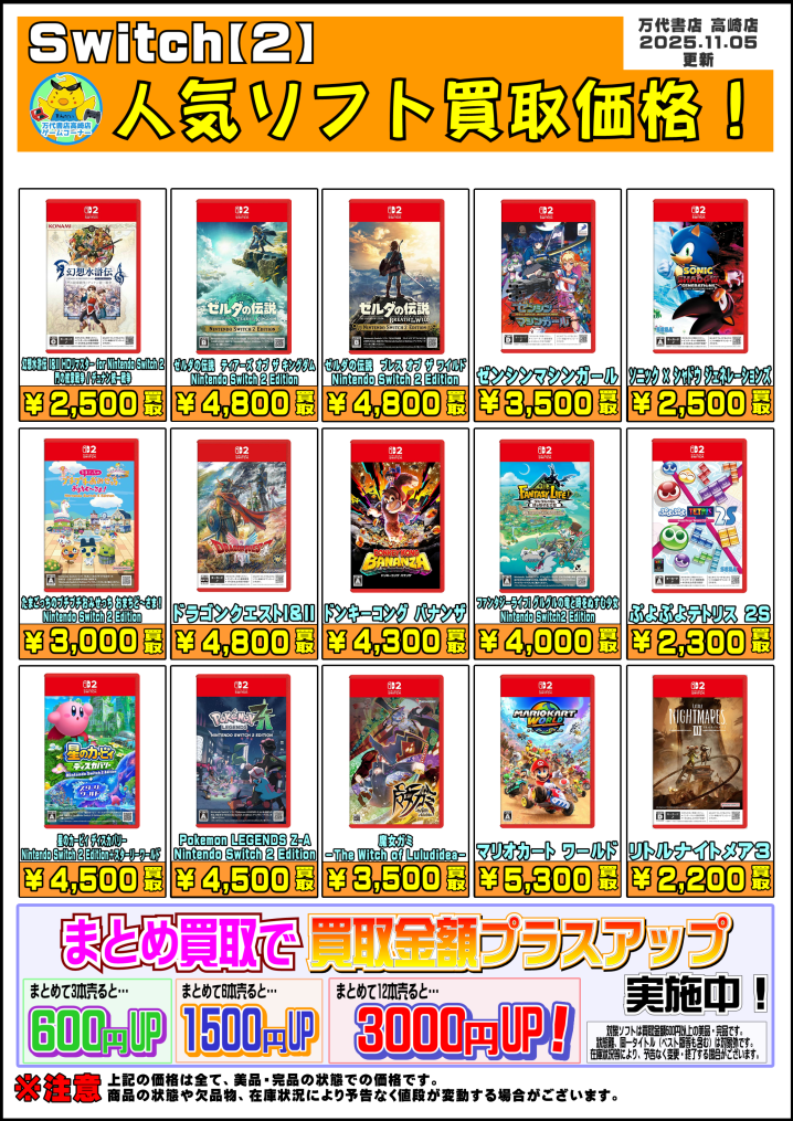 Switchソフト買取情報📣 ※2025/11/6現在の価格となります。 在庫状況・状態によってお値段が変動いたします。予めご了承ください。 *******************************…