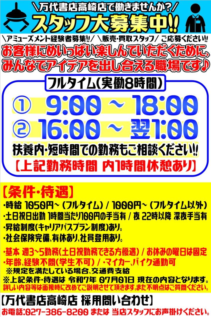 万代書店高崎店で一緒に働きませんか? ◆スタッフ大募集中◆ 万代書店高崎店ではスタッフ大募集中です。 好きなものに囲まれて働きませんか? アミューズメント経験者募集! 売場拡大につき、アミューズメントスタッフ大募集! も…