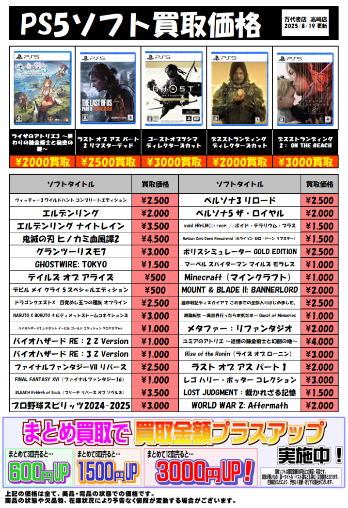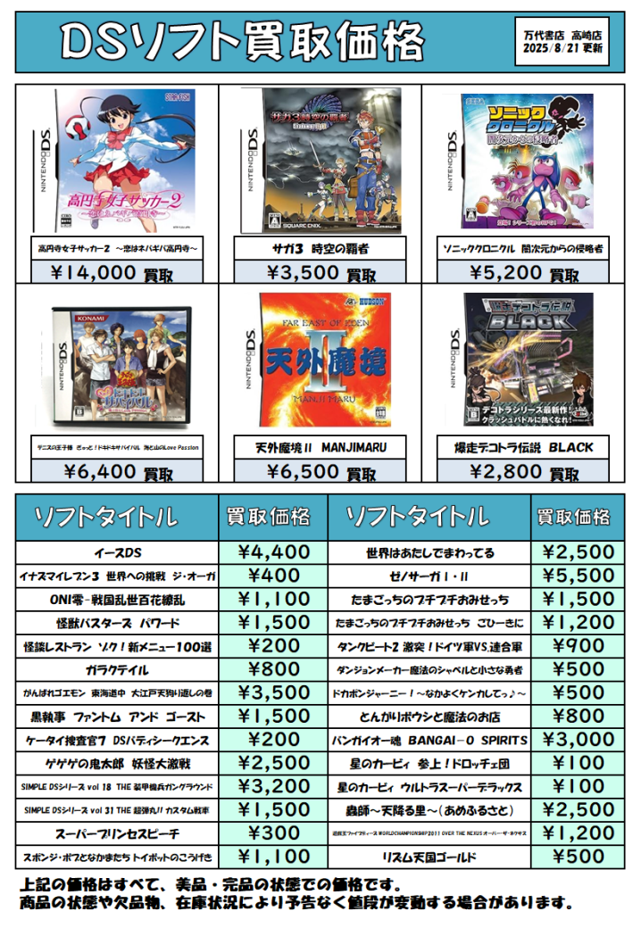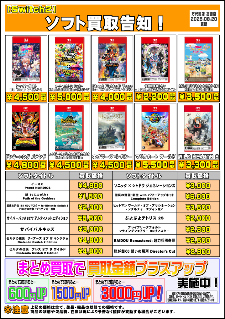 【R7.8.20更新】Switch&Switch2ソフト買取告知、掲載中! ※2025/8/20現在の価格となります。 在庫状況・状態によってお値段が変動いたします。予めご了承ください。 ************…