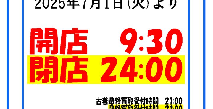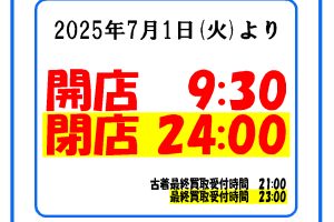 ★営業時間変更のお知らせ★ 2025年7月1日(火)より 閉店時間を25時→24時に変更致します 営業時間の変更に伴いに買取時間も変更になります お客様のご理解ご協力をお願い致します。 &nb…