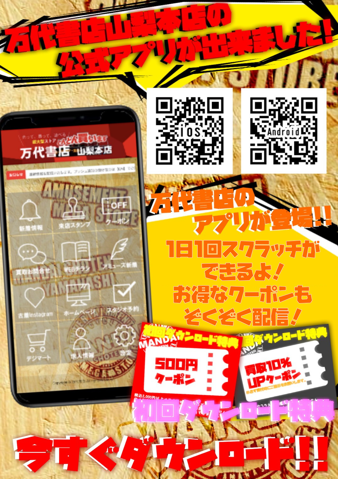 2021.08.14 お知らせ master_yamanashi 【お知らせ】★万代書店山梨本店の公式アプリが出来ました!★ ⭐万代書店山梨本店の公式アプリが出来ました!⭐ ・お店の最新情報をプッシュ通知でお知らせ! ・来店スタンプを集めてお得なクーポンをゲット! ・毎日一回チャレンジ出来るスクラッチクーポン! ・専用トークチャットで買取のお問い合わせにも対応! (お名前の登録が必要になります。) ⇩⇩⇩今すぐアプリストアでダウンロード!⇩⇩⇩ Google Play App Store