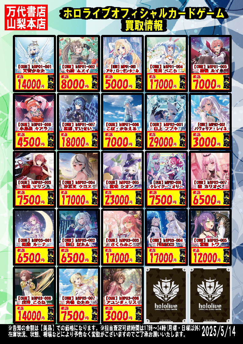 2025.05.15 買取告知 yamanashi 【ホロカ】【5/15更新】『hololive OFFICIAL CARD GAME』強化買取中!!!!【ホロライブ】【カード】 ちゃろ~! カード担当ヤッピーです! カードコーナーよりお知らせです! 『hololive OFFICIAL CARD GAME』 ドンドン買いますので是非お売りください!! カードを売るなら万代書店山梨本店! 〒400-0117 山梨県甲斐市西八幡4415 TEL:055-260-7021