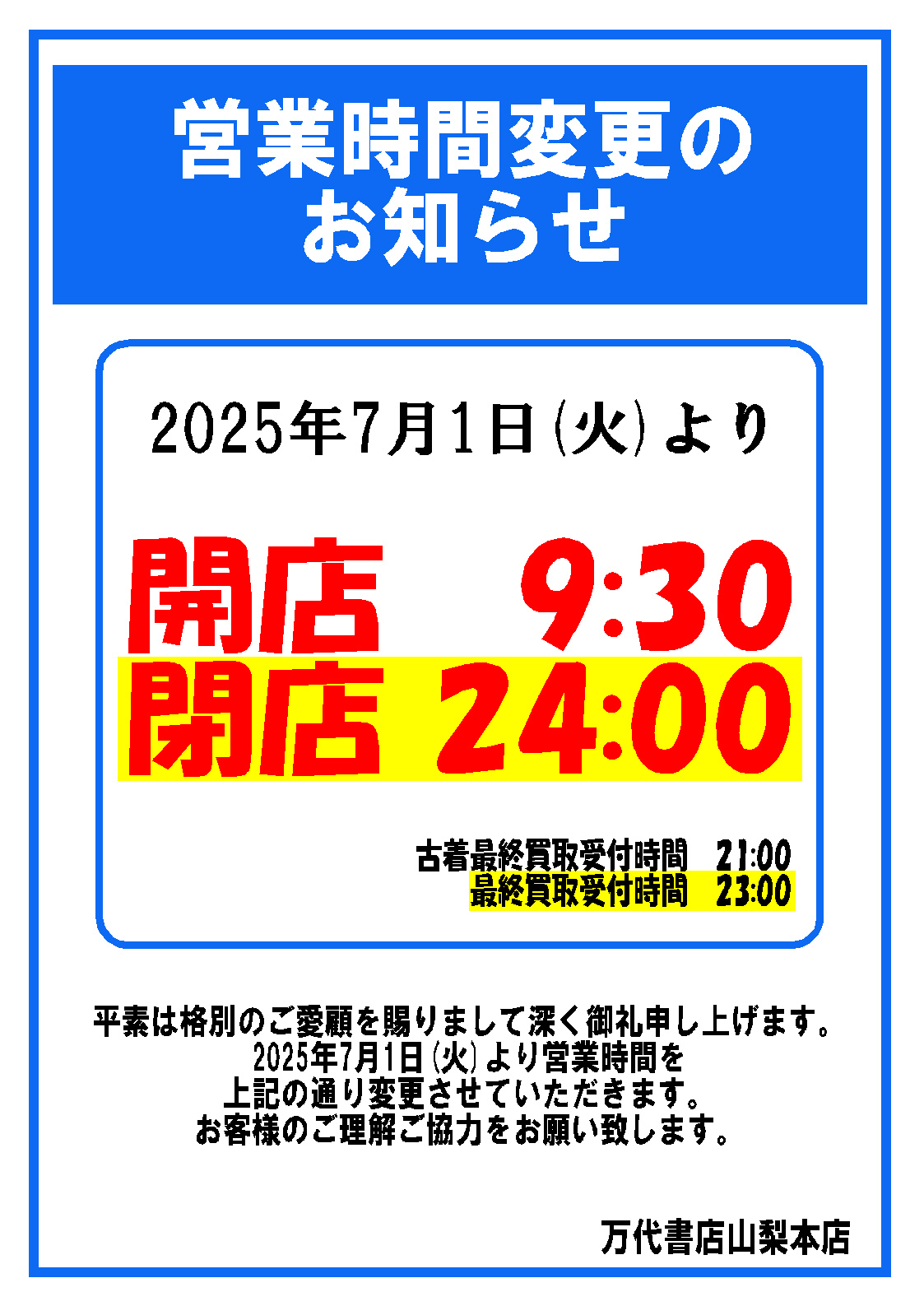 2025.06.01 お知らせ yamanashi ★★【重要なお知らせ】営業時間の変更のお知らせです!【重要なお知らせ】★★ ★営業時間変更のお知らせ★ 2025年7月1日(火)より 閉店時間を25時→24時に変更致します 営業時間の変更に伴いに買取時間も変更になります お客様のご理解ご協力をお願い致します。